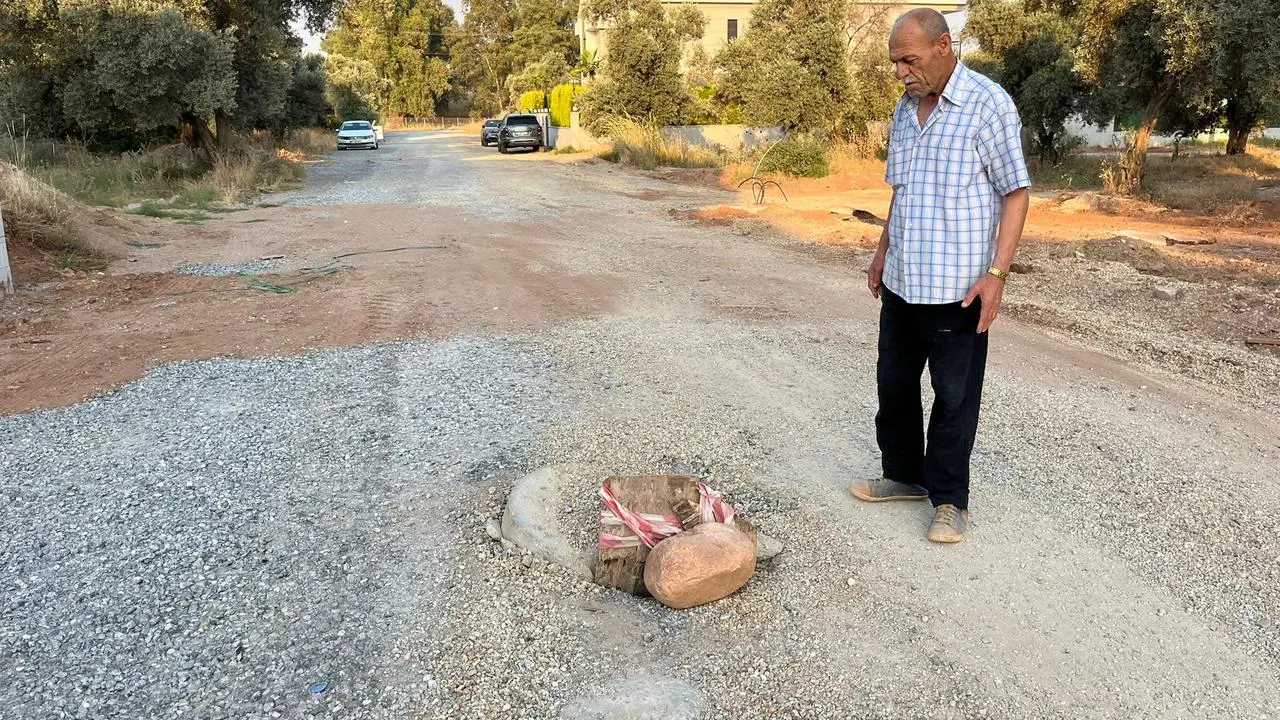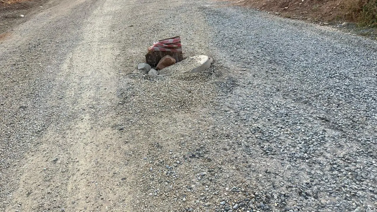 Yolun ortasındaki kırık rögar kapağı yayalar ve araçlar için risk oluşturuyor. Vatandaşlar kendi imkanlarıyla tehlikeyi önlemek için şerit çekti.