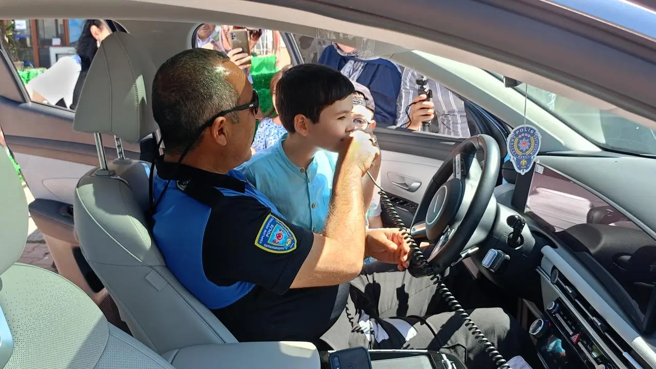 Özel çocuklar, polisler eşliğinde atları sevdi ve polis araçlarına bindi. Siren çalma ve temsili devriye gibi etkinliklerle keyifli zaman geçirdiler.