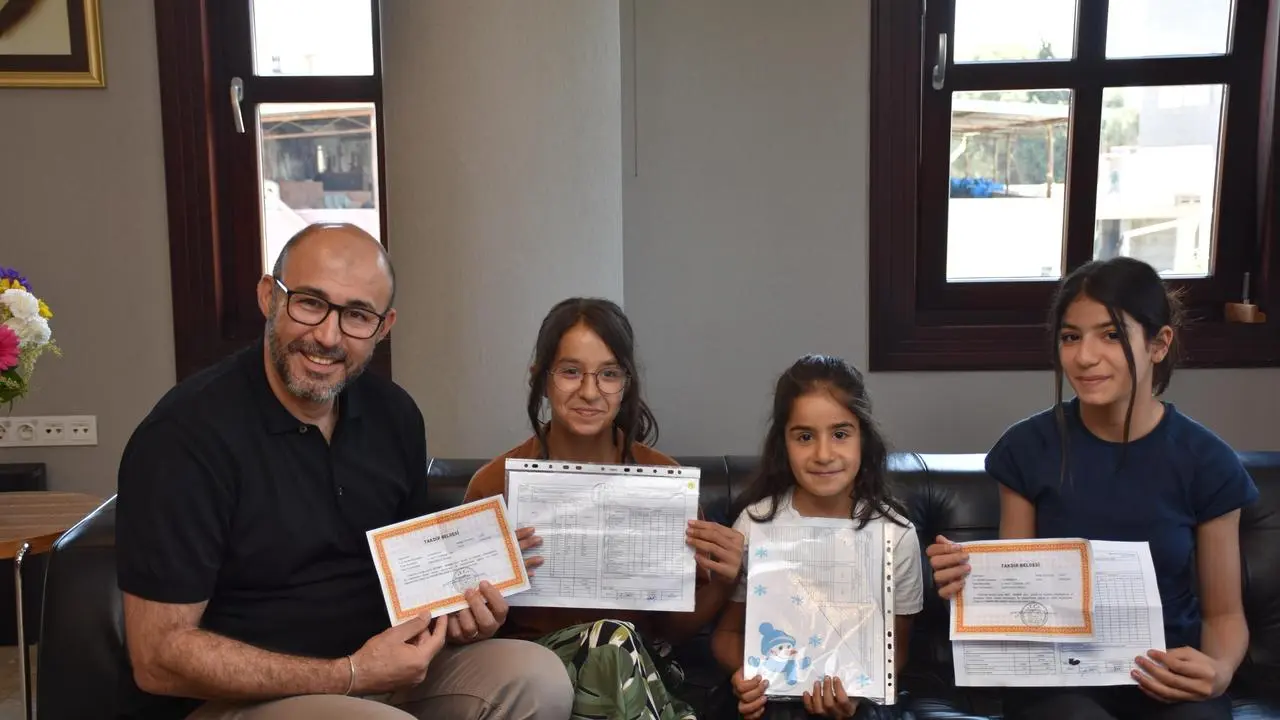 Özgür ve Piraye Zencirci babalarına karneleriyle sürpriz yaptı. Bu ziyaret başkanı duygusal anlar yaşattı.