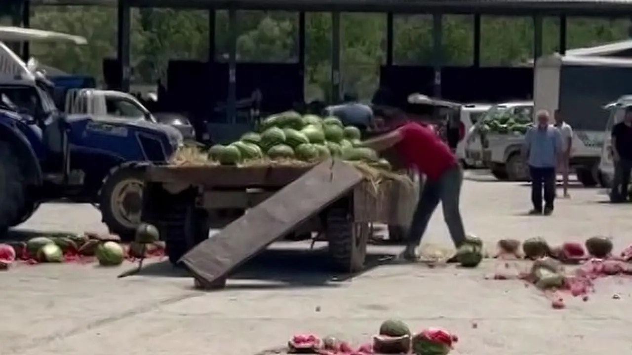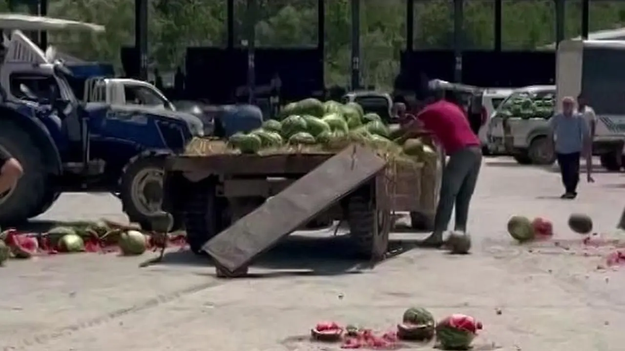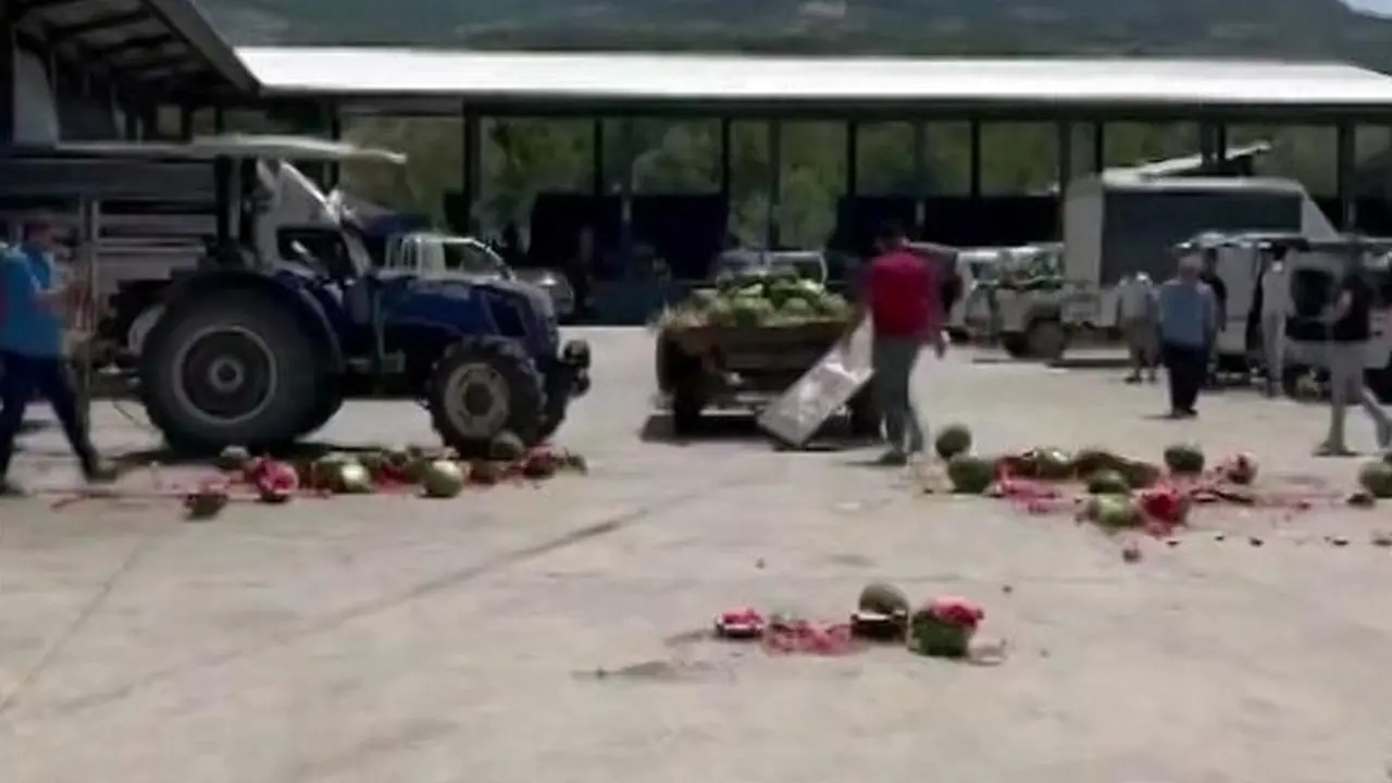 Mahsulünün para etmediğini söyleyen çiftçi, römork dolusu karpuzu yere fırlattı. Olay anları cep telefonu kamerasıyla kaydedildi.