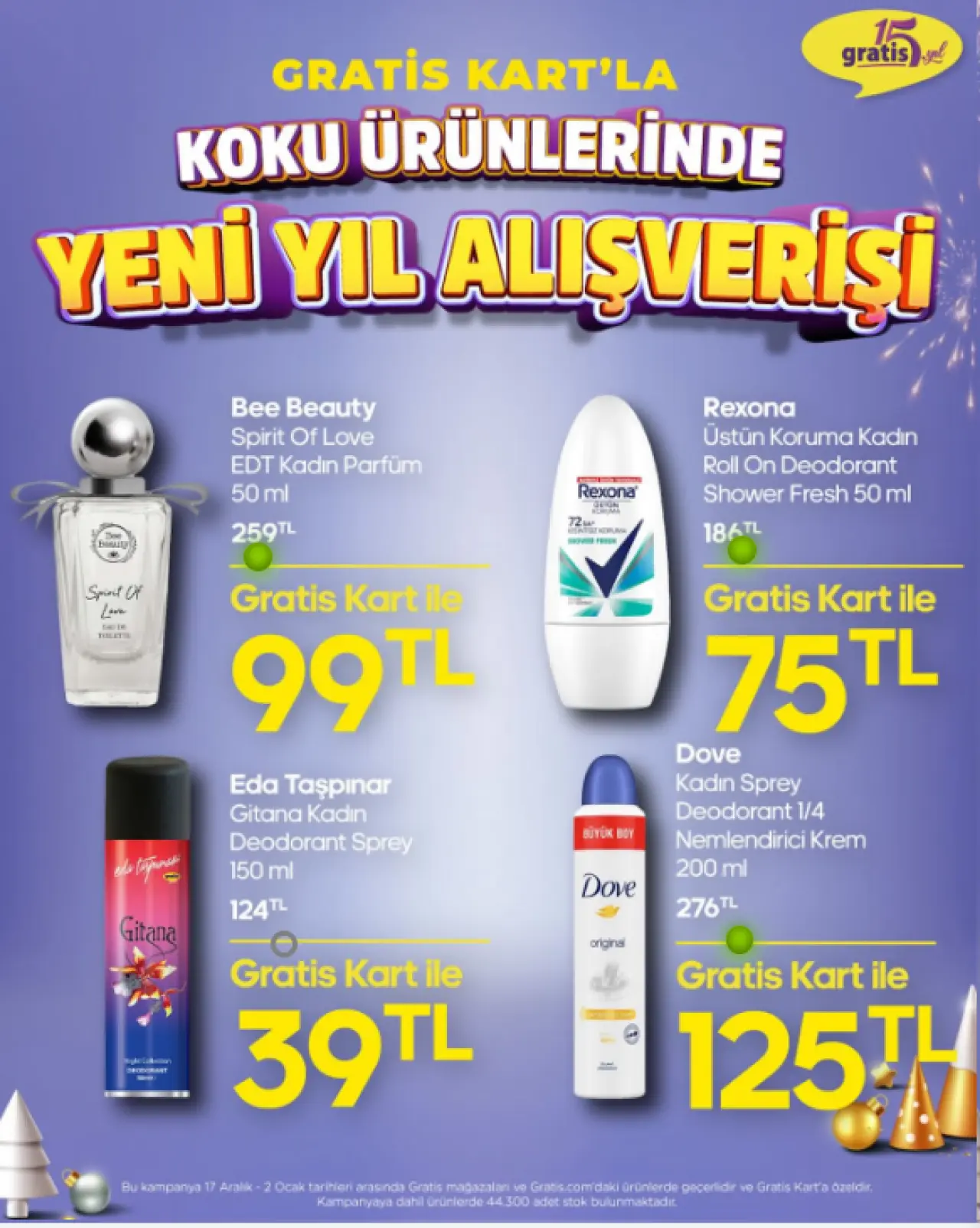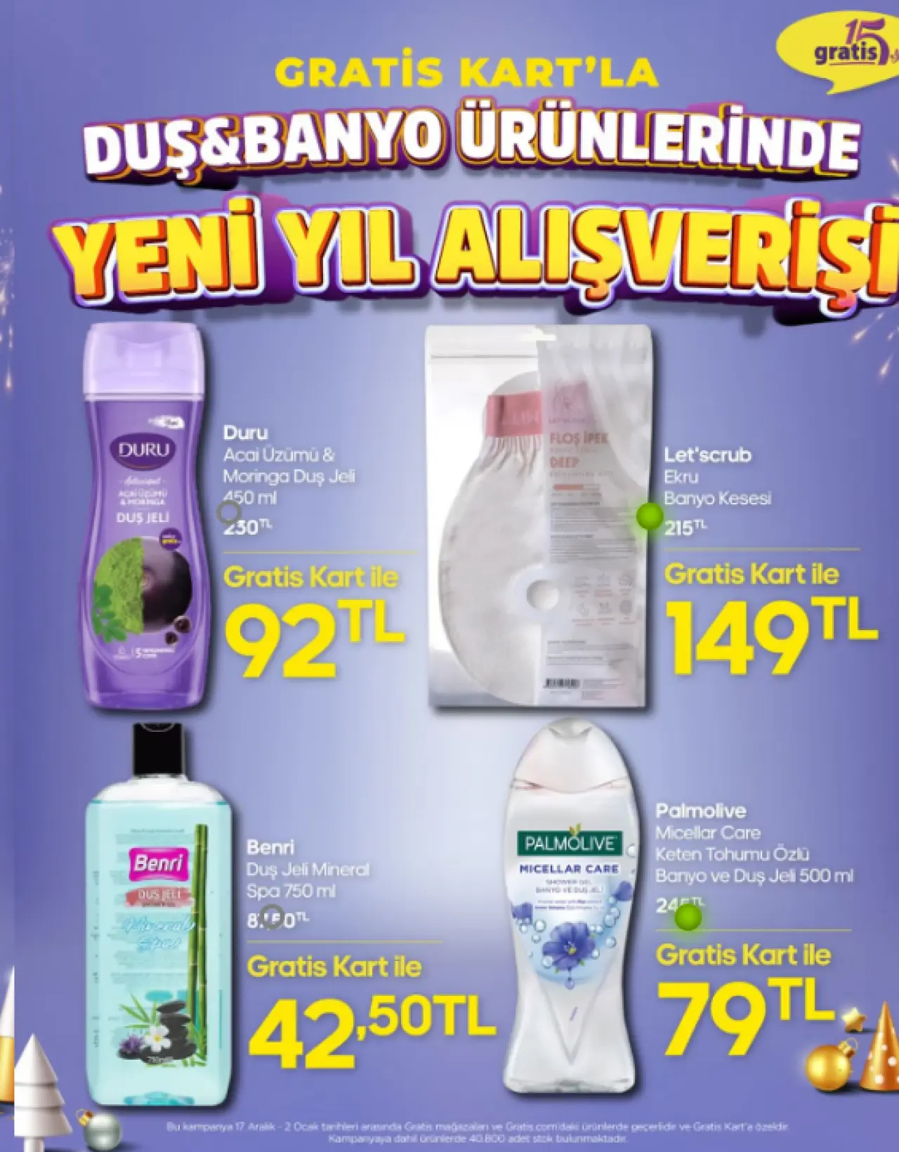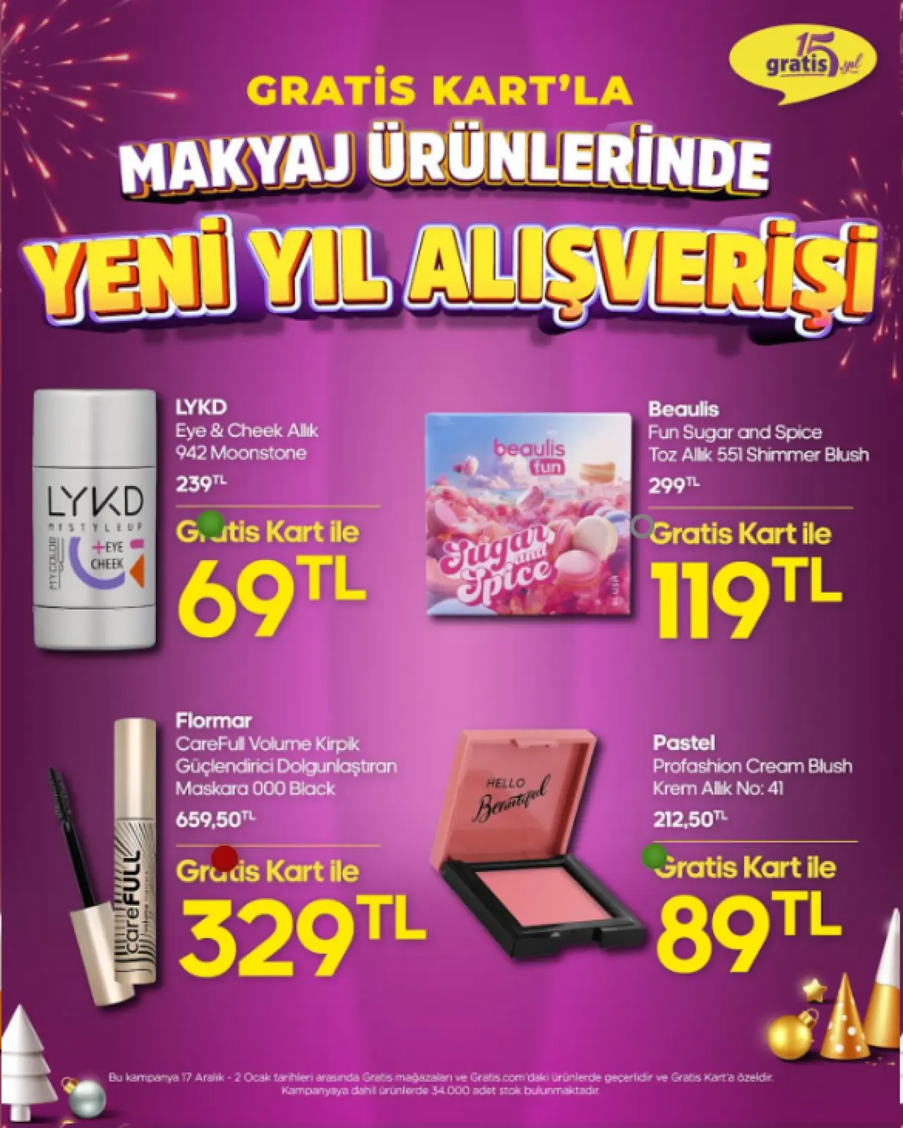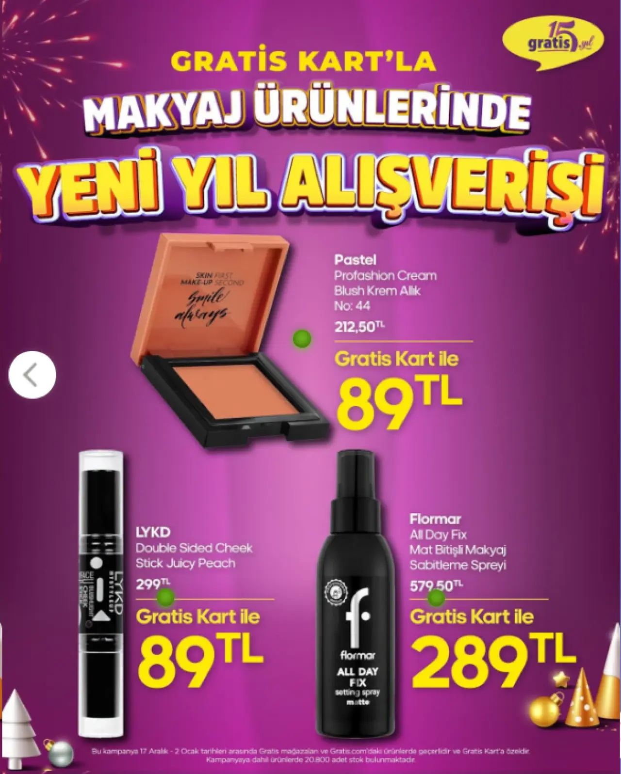 Gratis, makyaj, cilt bakımı ve saç bakım kategorilerinde birçok ürünü indirimli fiyatlarla sunuyor. Özellikle, ünlü kozmetik markalarının ruj, fondöten ve şampuan gibi ürünlerinde %50'ye varan indirimler dikkat çekiyor. Bu fırsatlar, güzellik tutkunları için kaçırılmaması gereken bir fırsat sunuyor.