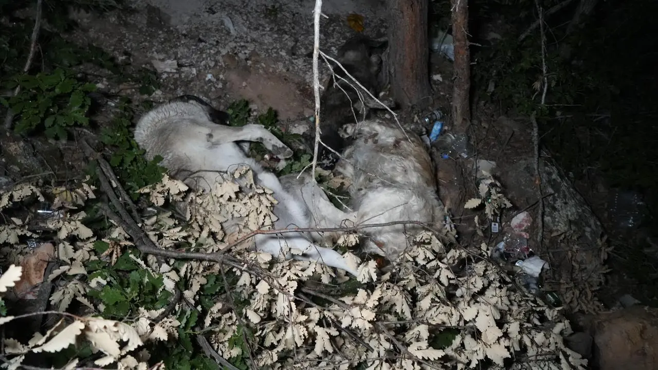 Çamlıca Mahallesi'ndeki ormanlık alanda 1'i hamile 4 köpek cesedi bulundu. Hayvanseverler köpeklerin kalplerine enjektörle sıvı verildiğini öne sürdü.