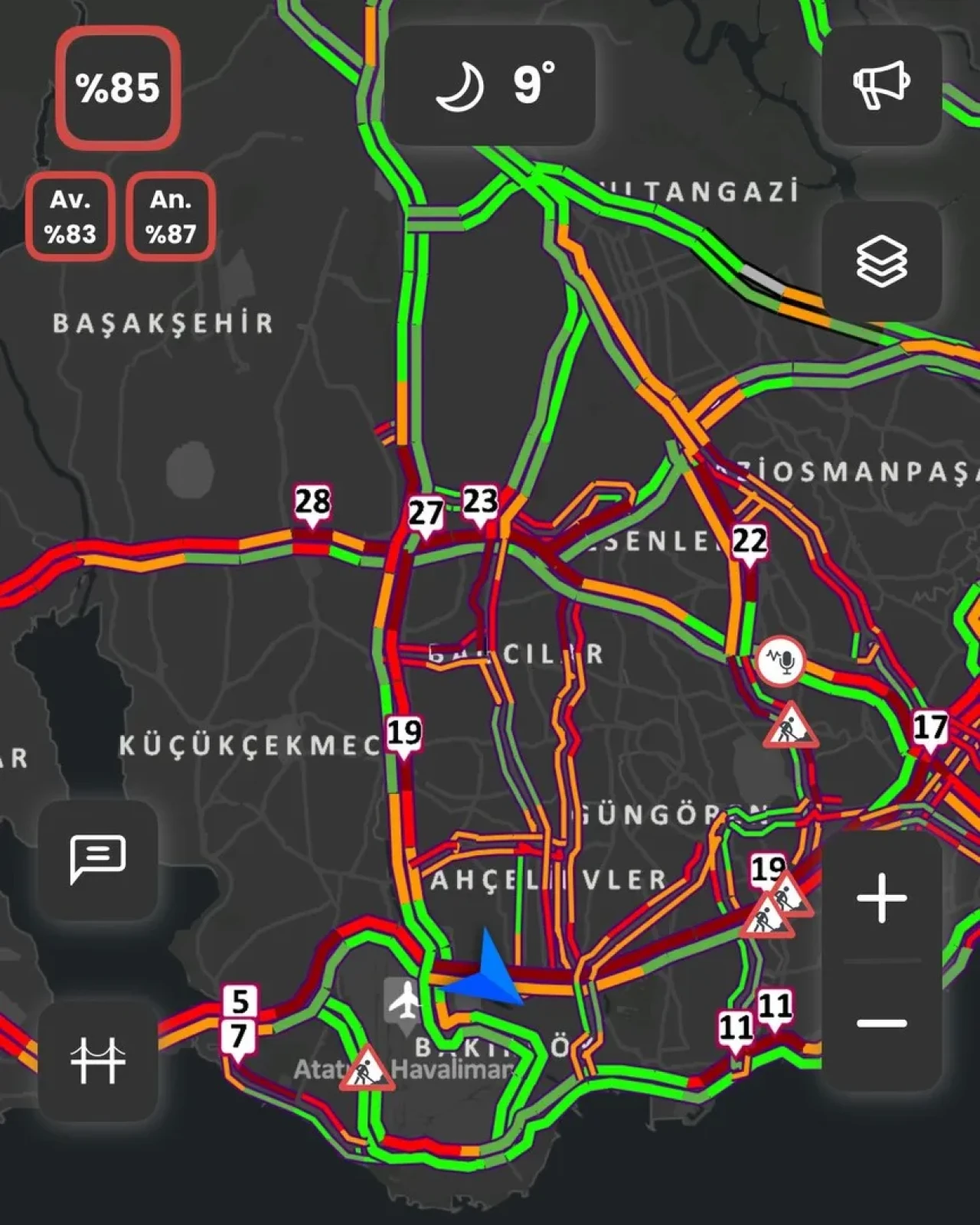 İstanbul'da akşam saatlerinde trafik yoğunluğu yüzde 85 seviyesine ulaştı. Özellikle iş çıkışı saatlerinde şehir genelinde yoğunluk dikkat çekti.
