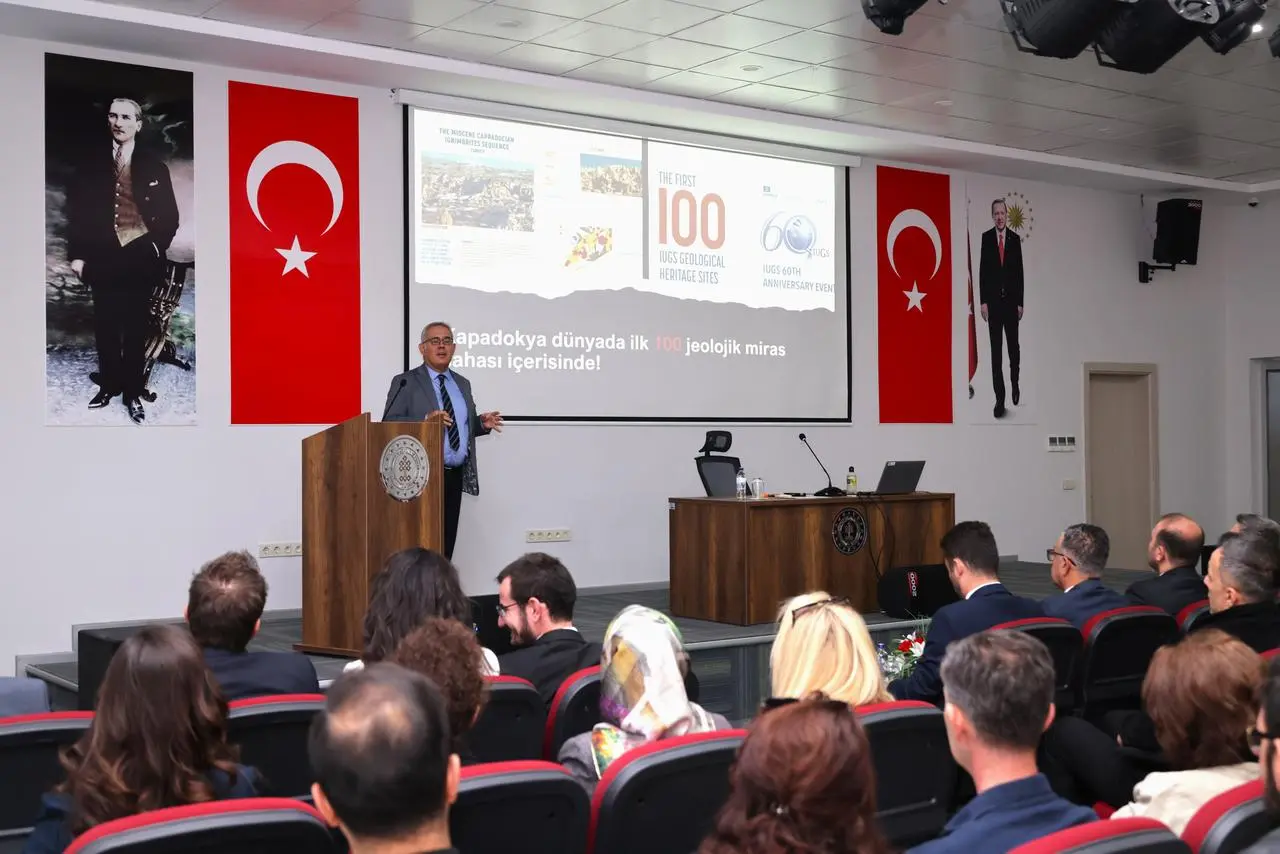 Prof. Dr. Mutluhan Akın, Kapadokya'nın kültürel değerlerini anlatan bir sunum gerçekleştirdi. Prof. Dr. Sabahattin Aykaç ise yapı güvenliği konusunu ele aldı.