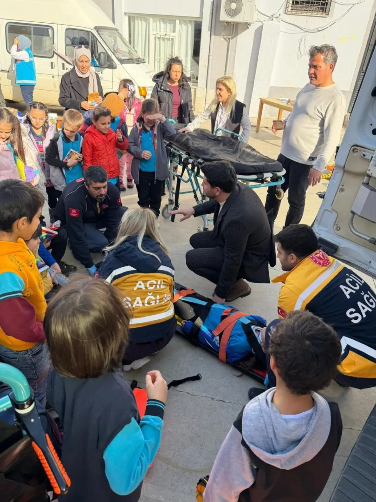 112 Acil Sağlık ve UMKE ekipleri öğrencilerle bir araya geldi. Ekipler, acil durumlarda yapılması gerekenleri çocuklara aktardı.