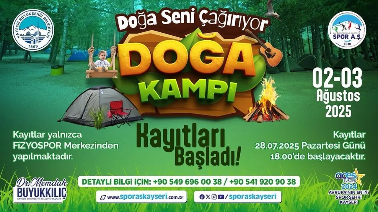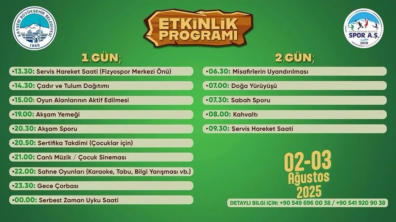 2-3 Ağustos tarihlerinde düzenlenecek yeni doğa kampı, Kayserilileri bekliyor. Sabah sporu ve farklı oyun alanlarıyla doğanın tadını çıkaracaklar.