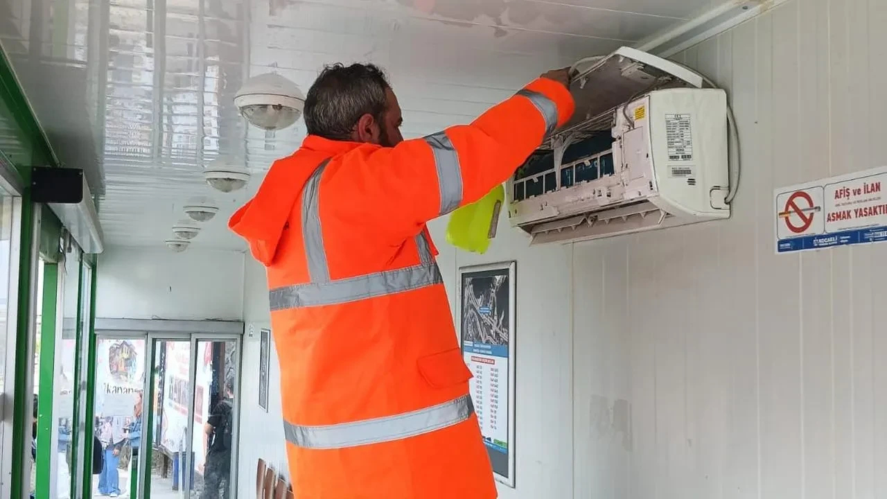 Umuttepe B Kapısı'ndaki akıllı durakta klima bakımı gerçekleştirildi. Ekipler, antibakteriyel ilaçlama ve filtre temizliği işlemlerini titizlikle yürüttü.