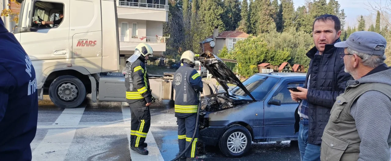Sürücü alevleri fark ederek aracı kenara çekti. Çevredeki vatandaşlar yangına ilk müdahaleyi gerçekleştirdi.
