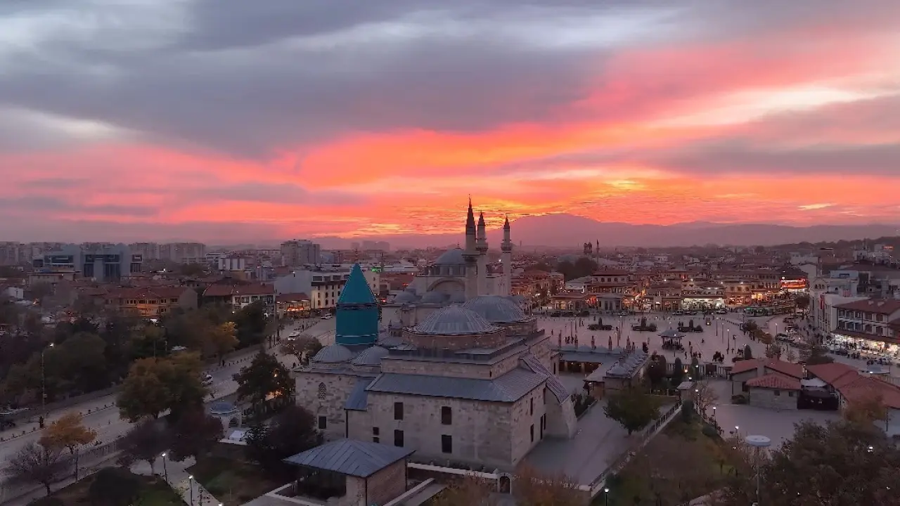 Güneşin batışı sırasında gökyüzünde oluşan kızıllık, Mevlana Müzesi ve Sultan Selim Camii'ni eşsiz bir atmosfere bürüdü. Drone ile çekilen görüntüler, şehrin simge yapılarını göz alıcı bir şekilde yansıttı.