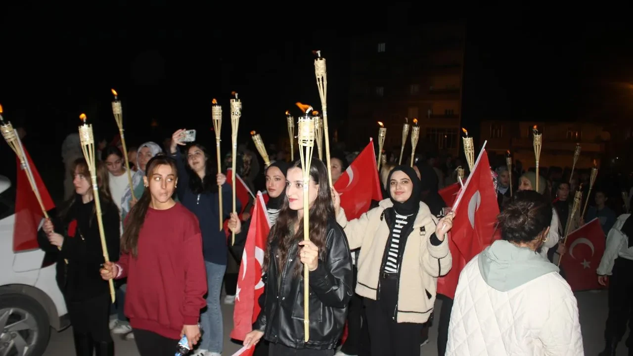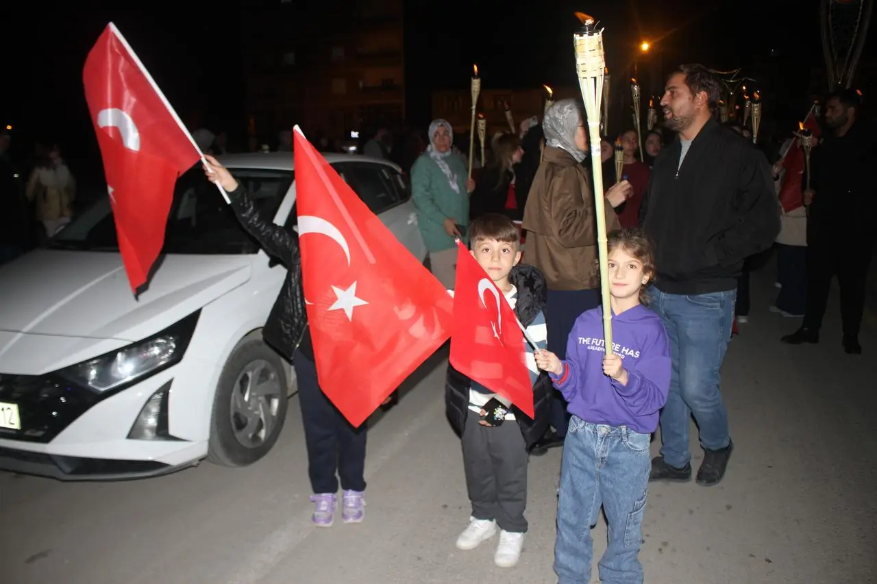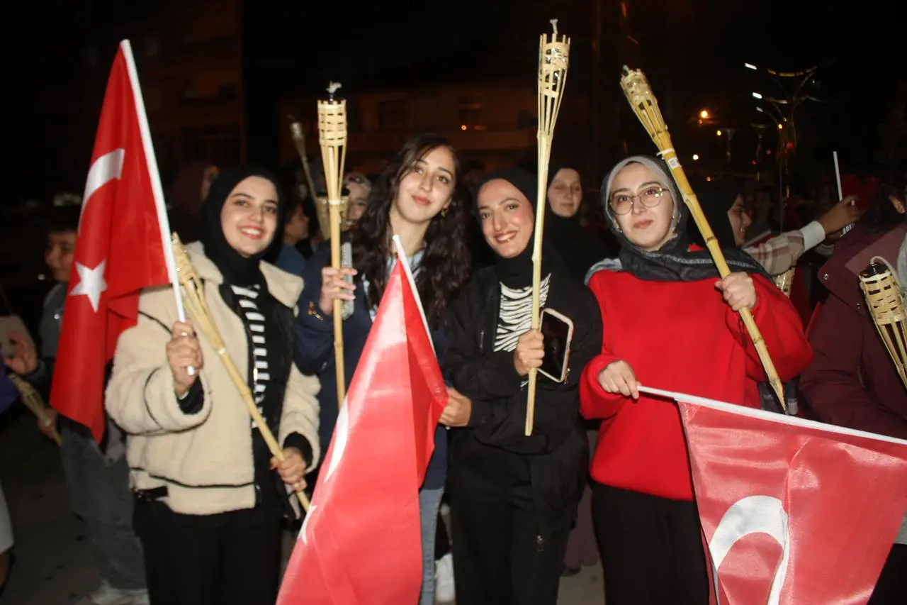Yılankıran Caddesi'nden başlayan fener alayı Cumhuriyet Meydanı’nda sona erdi. Vatandaşlar ellerinde bayraklarla marşlar söyleyerek yürüdü.