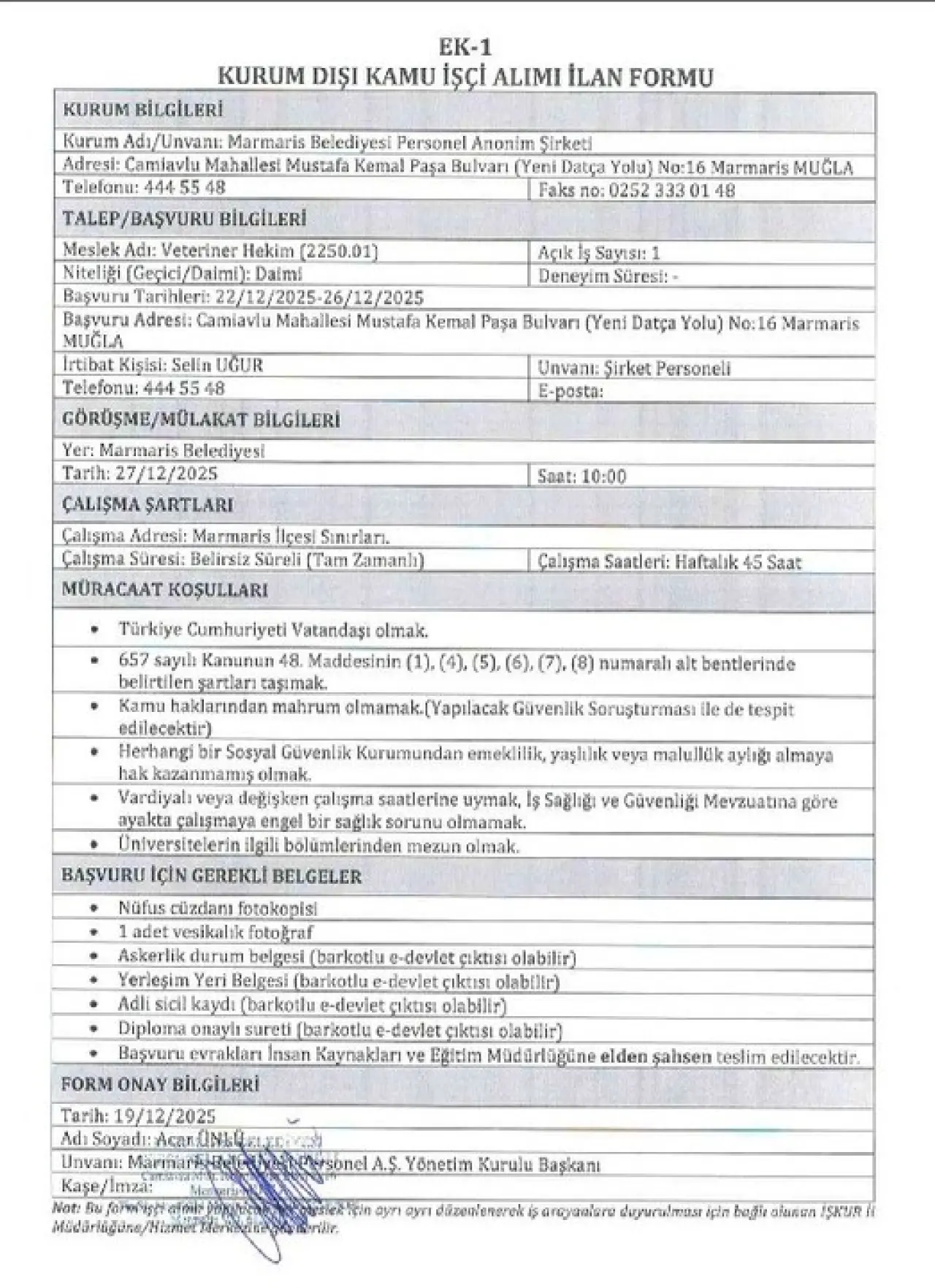 İlan, 1 veteriner hekim alımı için yayımlanmıştı. Başvuruların şahsen alınacağı ve mülakatın 27 Aralık'ta yapılacağı bilgisi verilmişti.