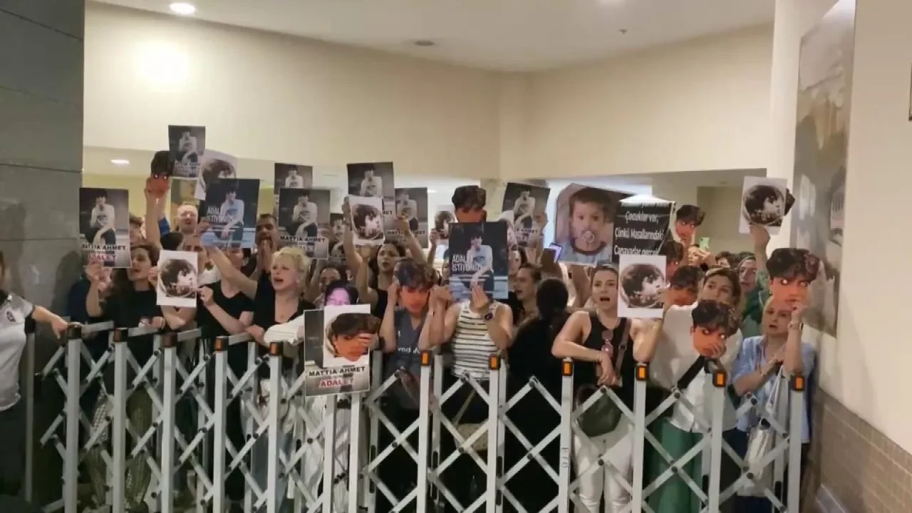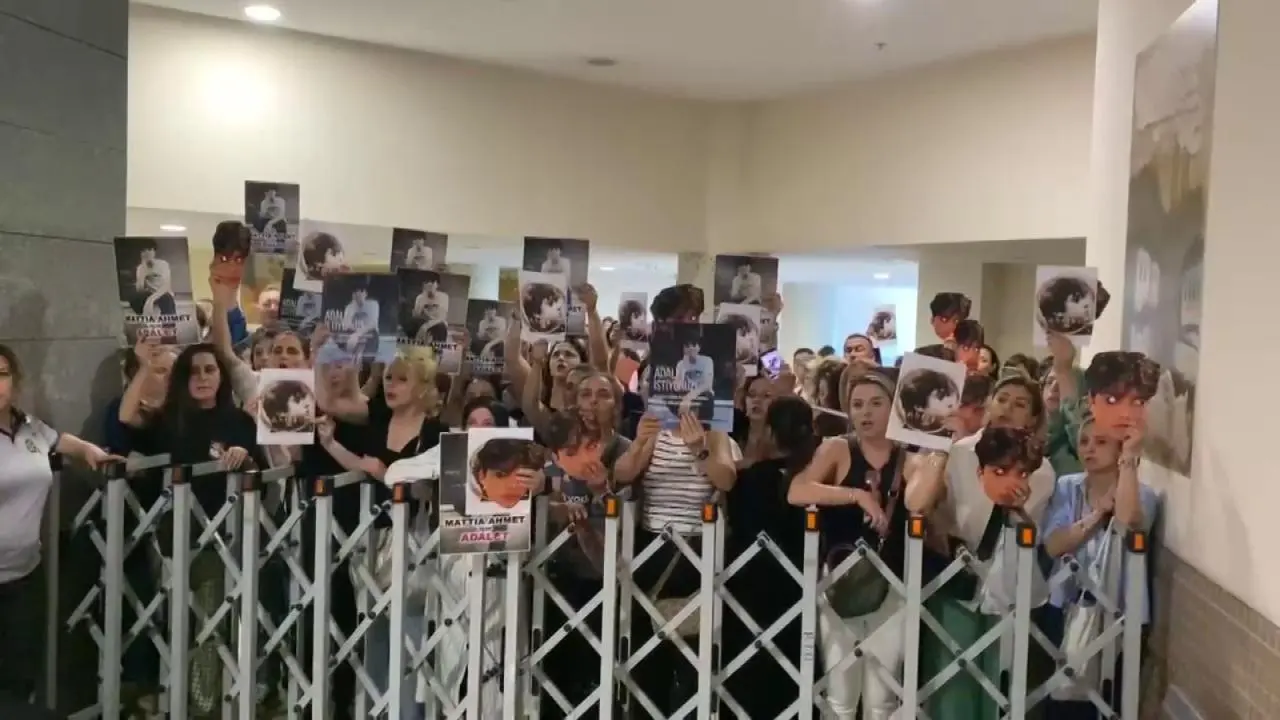 Vatandaşlar adliye önünde Mattia Ahmet'in fotoğraflarıyla protesto gösterisi düzenledi. Kalabalık grup "sokakta katil istemiyoruz" sloganları atarak tepkilerini dile getirdi.