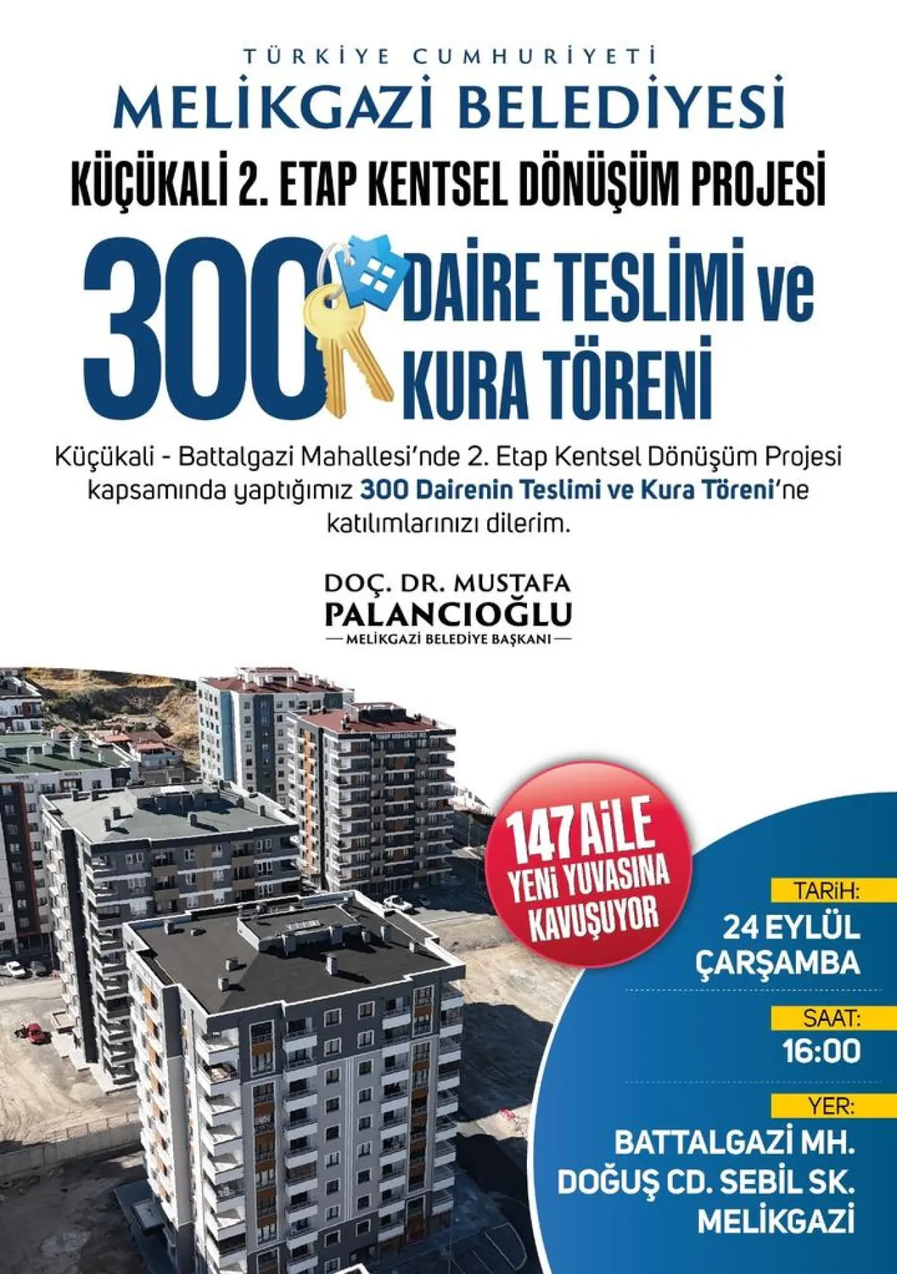 Melikgazi Belediyesi, Küçükali-Battalgazi Mahallesi'nde tamamlanan 300 daireyi sahiplerine teslim ediyor.