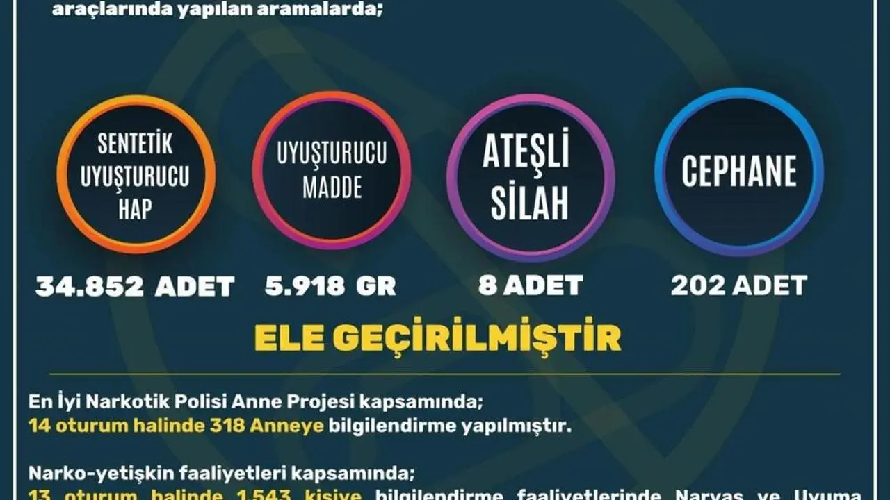Uyuşturucu ile mücadele kapsamında yapılan operasyonlarda ise 183 şüpheli yakalandı ve bu şüphelilerden 26'sı tutuklanarak cezaevine gönderildi. Şüphelilerin ev, iş yeri ve araçlarında yapılan aramalarda, 34 bin 852 adet uyuşturucu hap, 5 kilo 918 gram uyuşturucu madde, 7 tabanca, 202 tabanca fişeği ve 1 tüfek ele geçirildi.