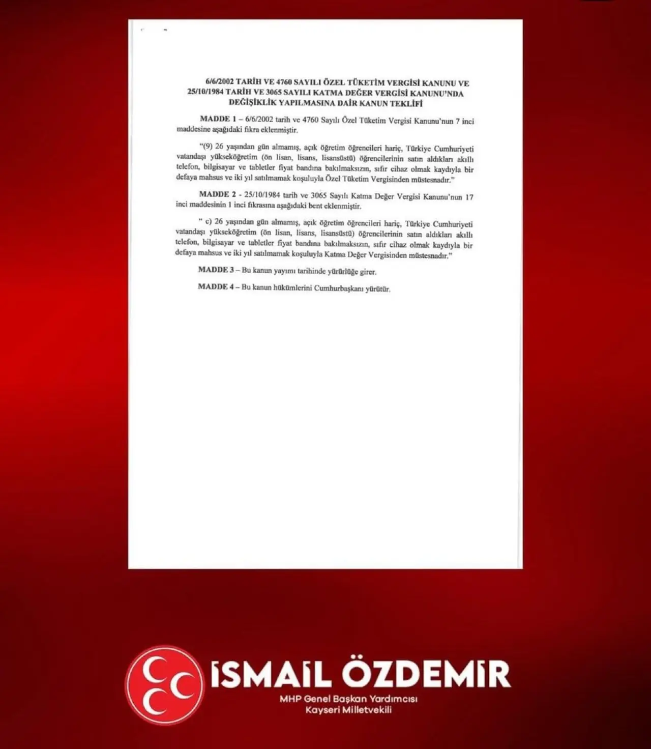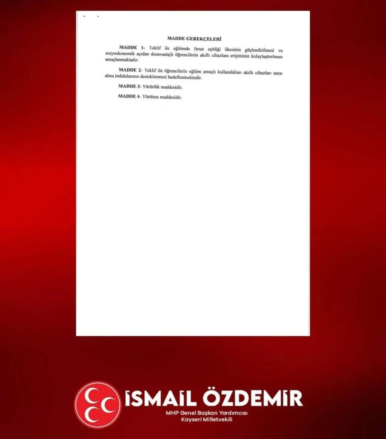 MHP, teklifin kanunlaşması için çalışmalarını sürdürüyor. Bu adım, gençlerin eğitim ve teknoloji ihtiyaçlarına destek olmayı amaçlıyor.