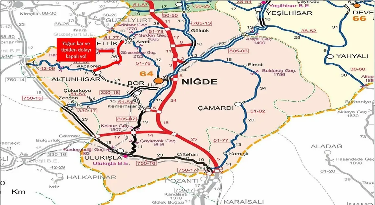 Niğde-Çiftlik yolunun 8 ile 30'uncu kilometreleri arasındaki bölüm trafiğe kapatıldı. Çiftlik-Altunhisar yolunun 32 ile 56'ncı kilometreleri de aynı şekilde geçici olarak kapalı.