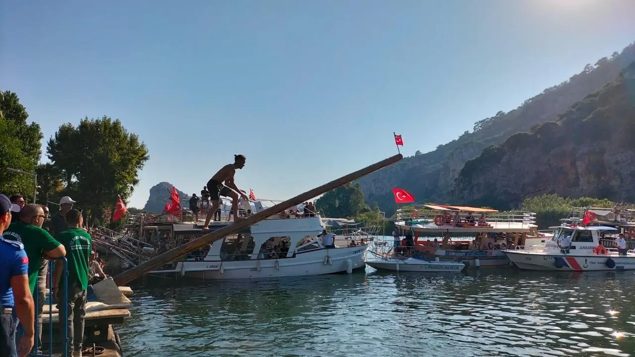 Kanalda kurulan platformda yarışmacılar zorlu mücadele verdi. Yağlı direkten bayrak kapma yarışı izleyenlere heyecanlı anlar yaşattı.