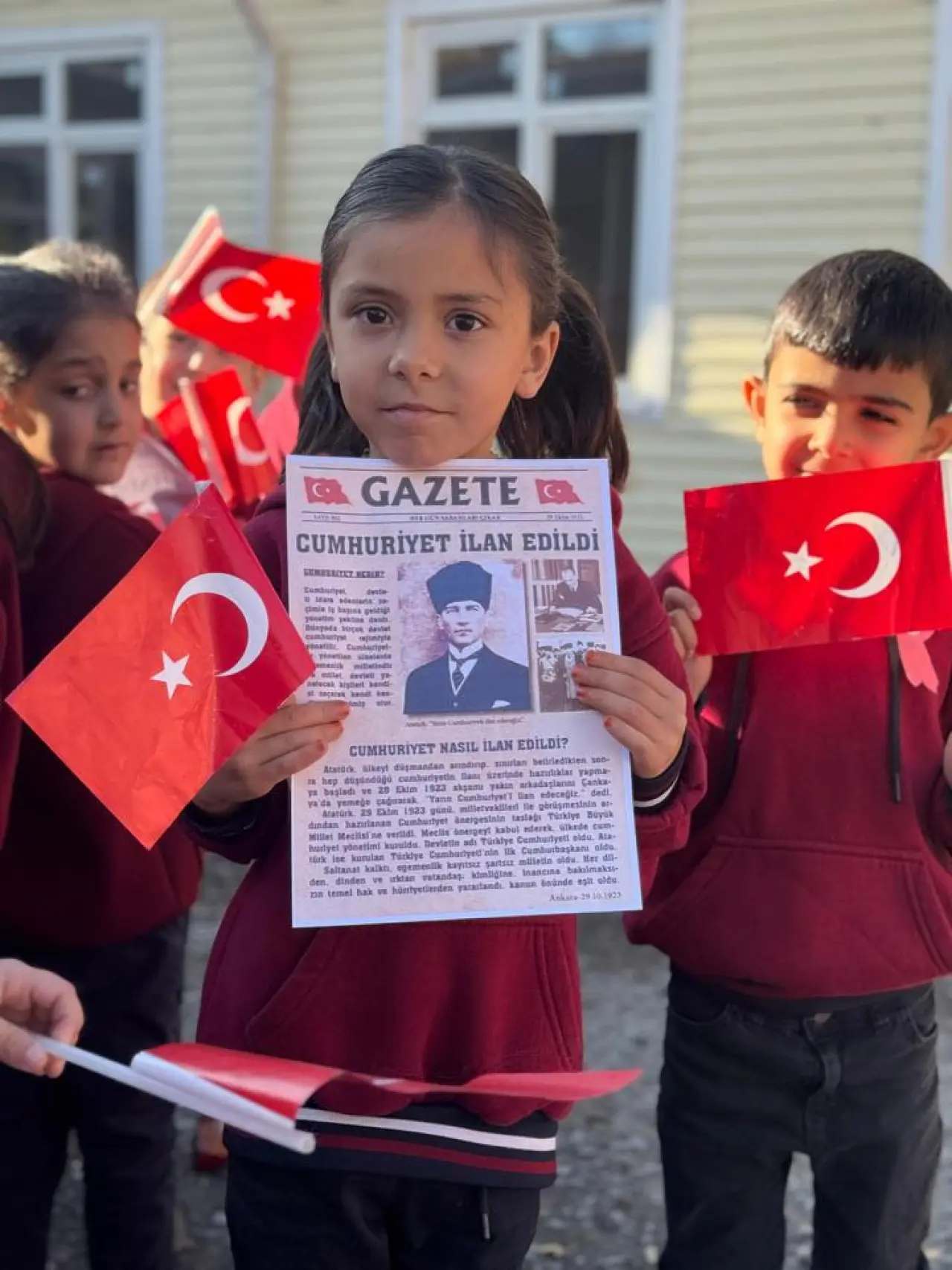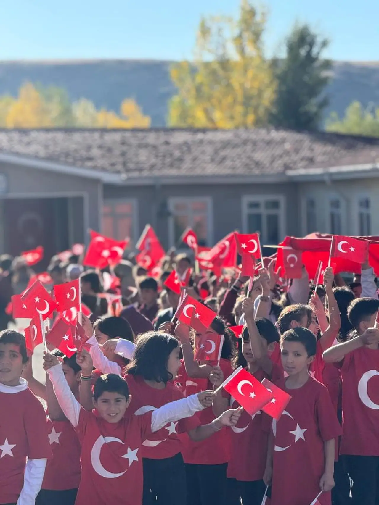Patnos Ortadamla İlkokulu ve Ortaokulu öğrencileri okul bahçesindeki törenin ardından marşlar eşliğinde yürüdü. Ellerindeki bayrakları sallayarak "Cumhuriyet bizimle yükseliyor" mesajını verdiler.