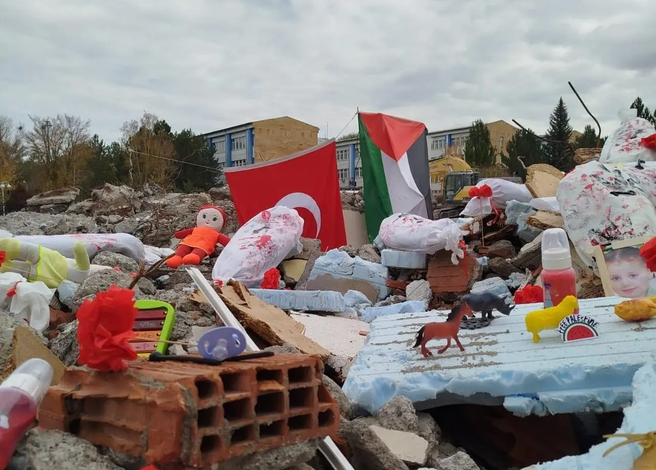 Kampüsteki bir inşaat alanı, Filistin’deki dramı yansıtan enstalasyonla dönüştürüldü. Bu çalışma, yaşanan acıları izleyicilere hissettirmek amacını taşıyor.