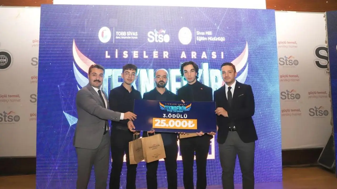 Sivas'ta liseler arası düzenlenen 'Teknofikir' Proje Yarışması'nda dereceye giren okullar ve öğrencileri ödüllendirildi. Sivas Valiliği, İl Millî Eğitim Müdürlüğü, Ticaret ve Sanayi Odası ve TOBB Sivas Genç Girişimciler Kurulu iş birliğiyle hayata geçirilen proje kapsamında düzenlenen yarışma, gençlerin yenilikçi fikirlerini ortaya çıkarmayı hedefliyor. Törende, dereceye giren öğrencilere ödülleri takdim edilirken, projeler büyük beğeni topladı.