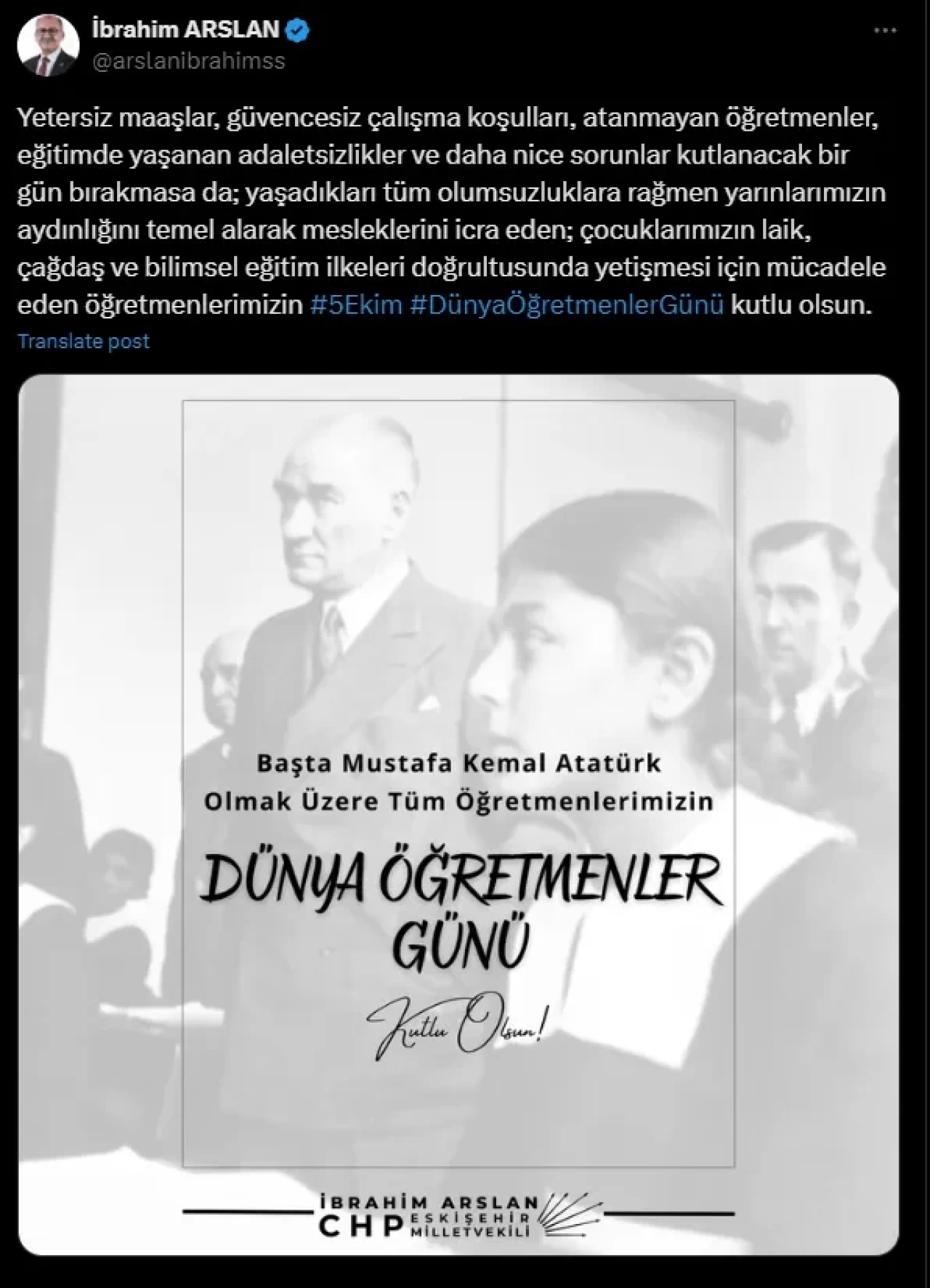“İlgisiyle, sevgisiyle ve şefkatiyle evlatlarımızı yetiştiren istikbalimizin mimarı öğretmenlerimizin 5 Ekim Dünya öğretmenler gününü tebrik ederim.”