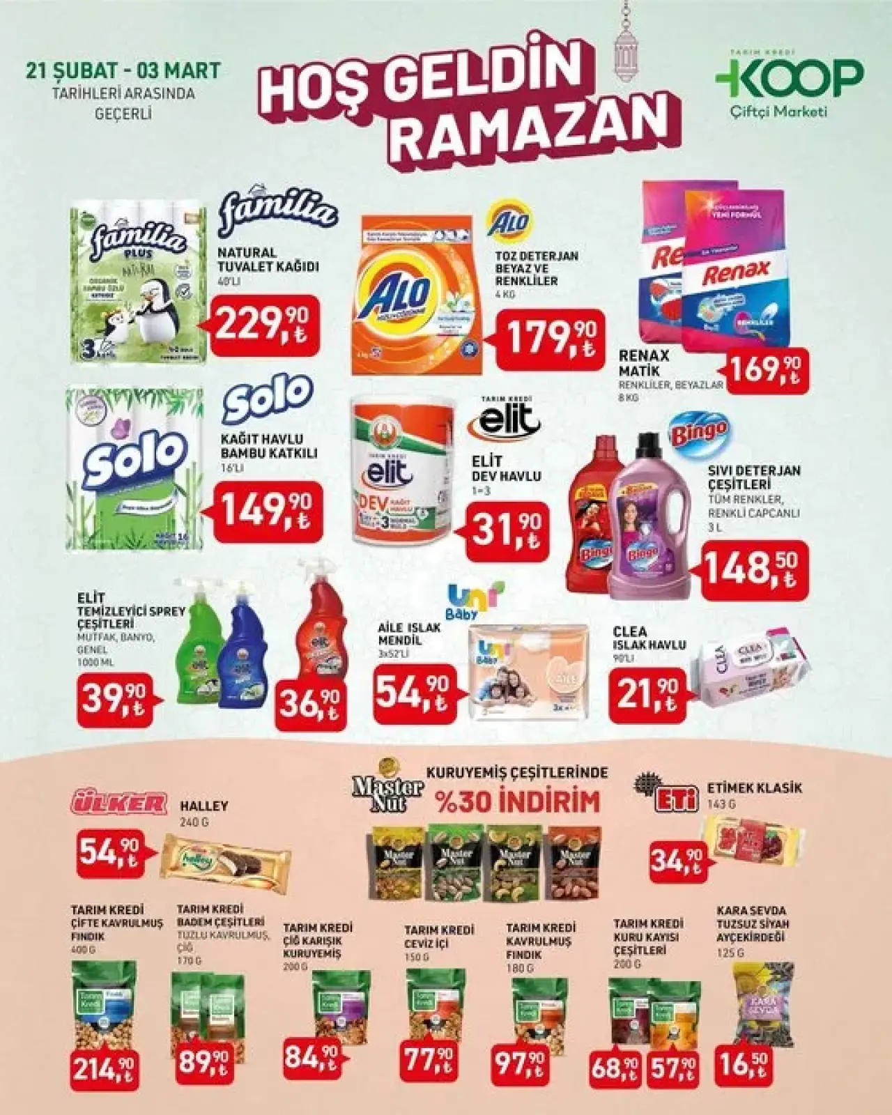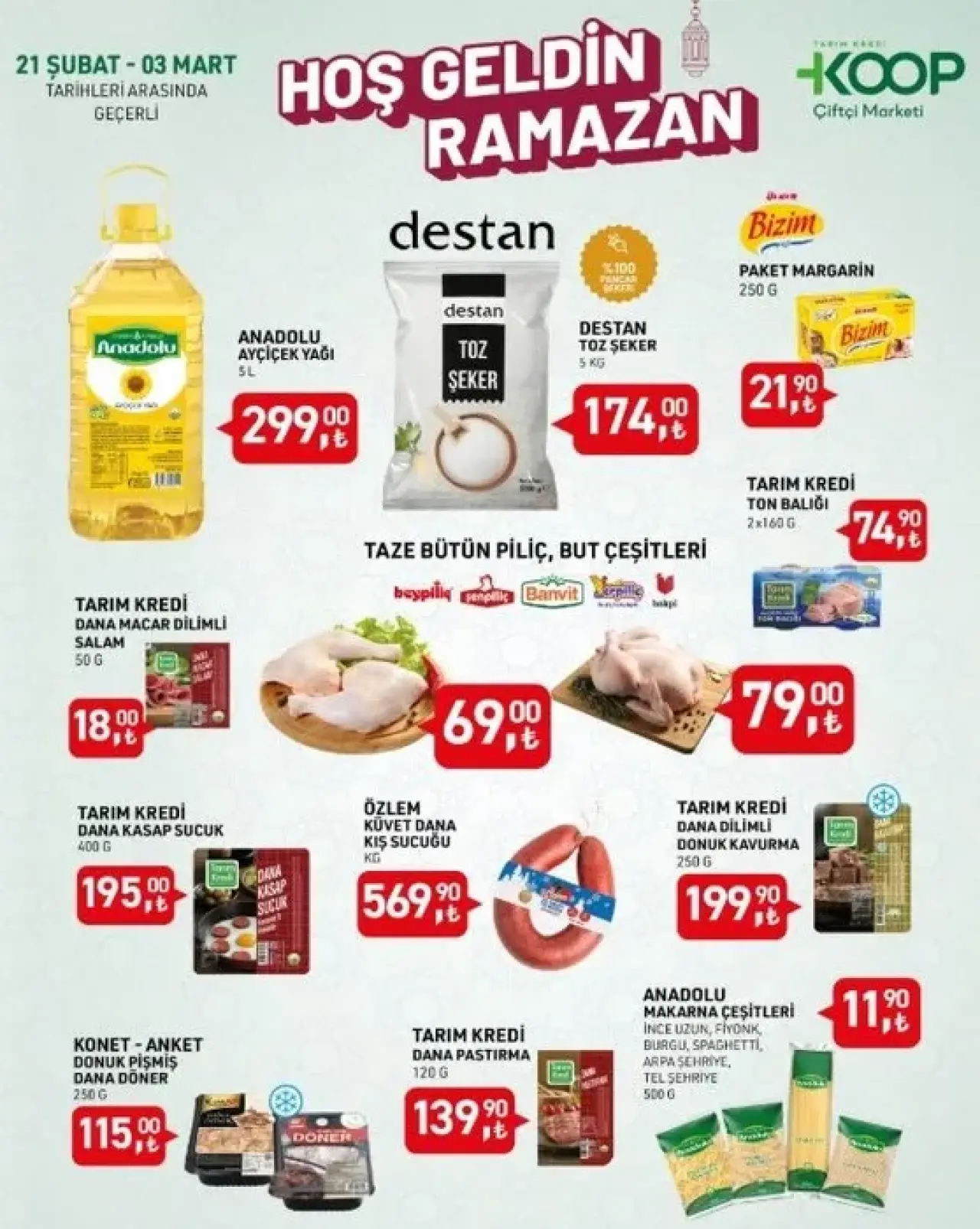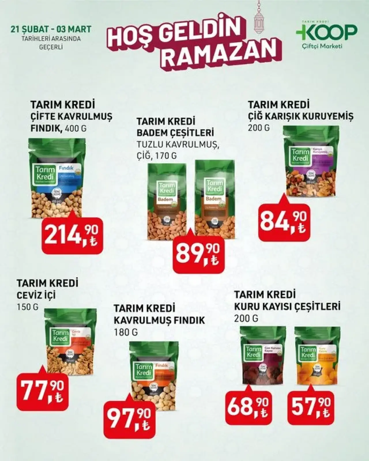 Ramazan öncesi gerçekleştirilen kampanyada, pirinç, bulgur, makarna, yağ, şeker gibi temel gıda ürünlerinin fiyatları sabitlendi. Tarım Kredi, 15 Mart tarihine kadar, bu ürünlerde herhangi bir zam yapmayacak ve fiyatlar sabit kalacak. Bu sayede vatandaşlar, kaliteli ve uygun fiyatlı ürünlere kolayca ulaşabilecekler.