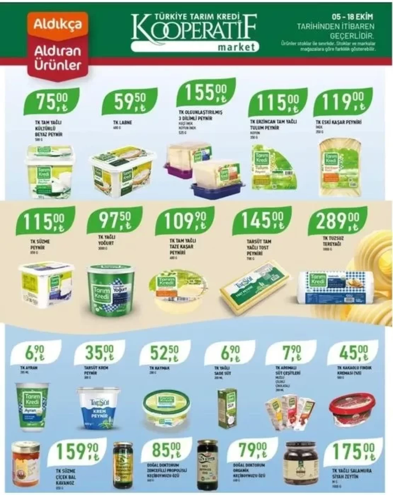 Bu dönemde, özellikle süt ürünleri ve kahvaltılıklar öne çıkıyor. Tarım Kredi Kooperatif, çeşitli peynir çeşitleri, yoğurtlar ve diğer kahvaltılık ürünlerde indirimler sunuyor. İşte indirimli ürünlerin bir kısmı: