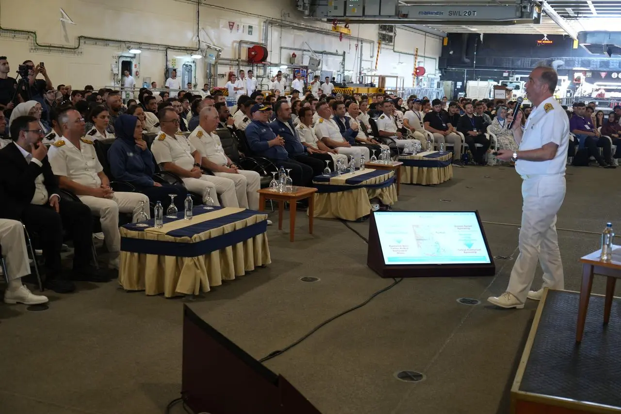 Geminin uçuş güvertesinde brifingler verilerek denizcilik hakkında bilgilendirmeler yapıldı. Gençler, geminin teknik özelliklerini öğrenerek deneyim kazandı.
