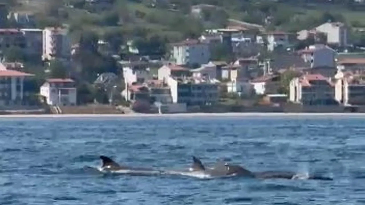 Tekirdağ'ın Süleymanpaşa ilçesi açıklarında, denizde neşeyle yüzen bir yunus sürüsü görüntülendi. Barbaros Mahallesi açıklarında tekneyle seyir halinde olan bir vatandaş, denizin yüzeyine çıkan yunusları fark ederek bu anları cep telefonu kamerasıyla kayda aldı. Yunusların suyun üzerinde art arda belirmesi ve tekrar suya dalmaları, izleyenlere keyifli anlar yaşattı. Sürü halinde yüzen yunuslar, bir süre sonra gözden kayboldu.