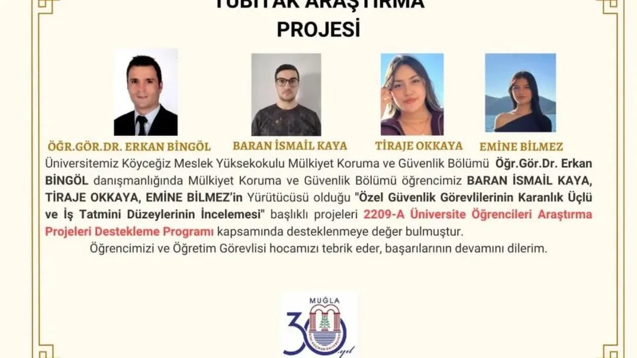 Muğla'nın Köyceğiz ilçesindeki Köyceğiz Meslek Yüksek Okulu Mülkiyet Koruma ve Güvenlik Bölümü öğrencilerinin hazırladığı bir proje, Türkiye Bilimsel ve Teknik Araştırma Kurumu (TÜBİTAK) tarafından desteklenmeye layık görüldü. "Özel Güvenlik Görevlilerinin Karanlık Üçlü ve İş Tatmini Düzeylerinin İncelenmesi" başlıklı proje, 2209-A Üniversite Öğrencileri Araştırma Projeleri Destekleme Programı kapsamında kabul edildi. Proje ekibi, bu destekle önemli bir araştırma fırsatı elde etti.