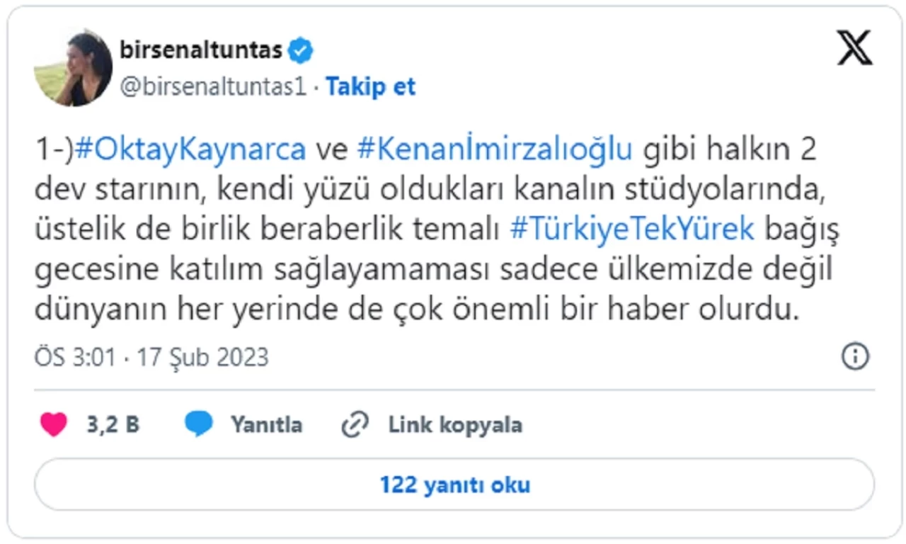 Birsen Altuntaş, sosyal medya hesabı üzerinden yaptığı açıklamada, Oktay Kaynarca ve Kenan İmirzalıoğlu’nun depremzedelere yardım için düzenlenen kampanyada ATV’nin isteğiyle yer almadığına dair haberini savundu. "Bu haber dünya çapında önemli olurdu" diyen Altuntaş, haberin doğruluğunu teyit ettiğini ve herhangi bir korku duymadan yazdığını ifade etti. İşten çıkarılmasıyla ilgili olarak ise bu durumu anlayışla karşıladığını ve kendisine destek veren herkese teşekkür etti.