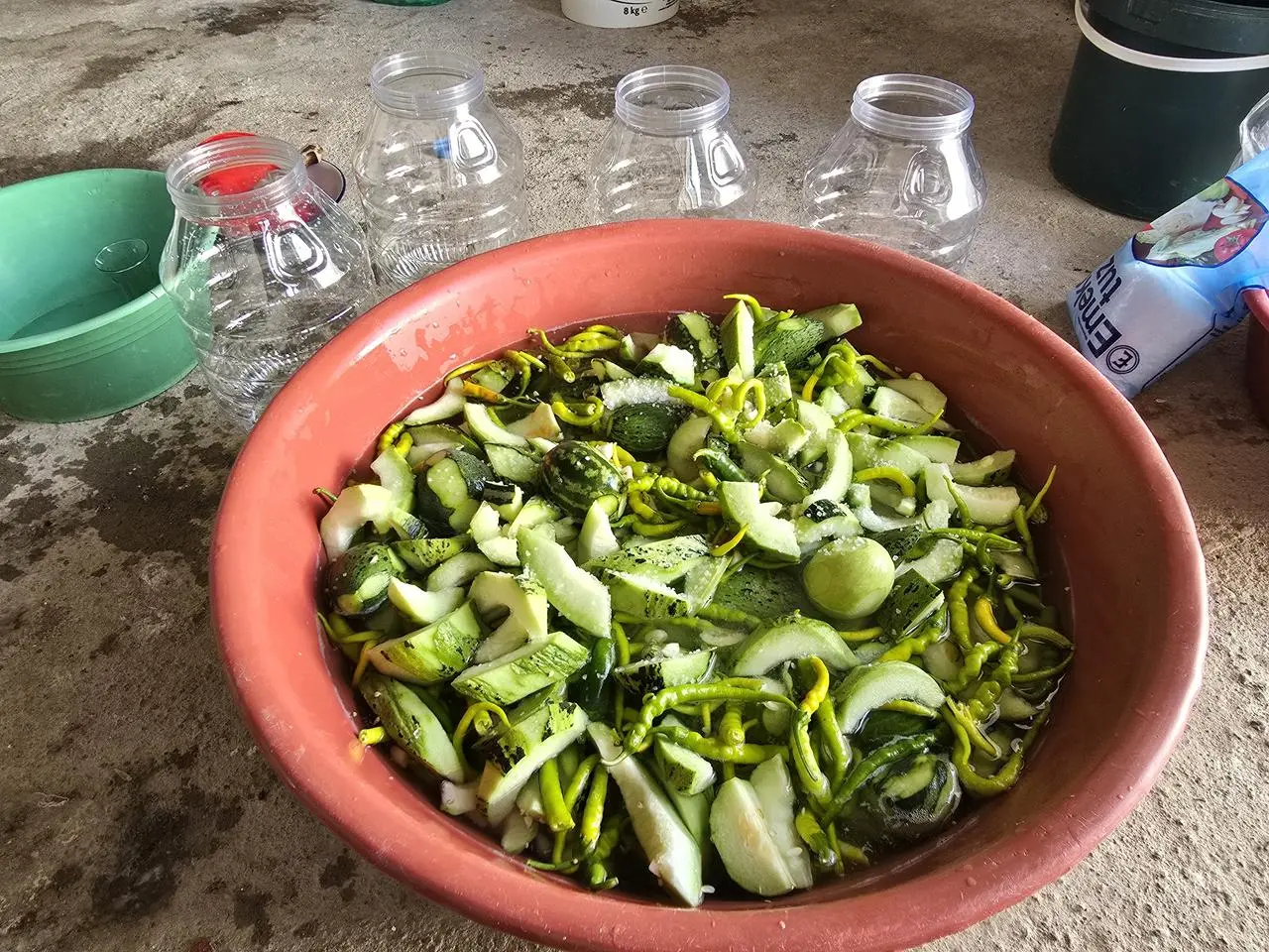Tarladan toplanan kelekler şeritler halinde soyuluyor ve çekirdekleri çıkarılıyor. Turşular limon tuzu ve sirke ile hazırlanıp bidonlara dolduruluyor.