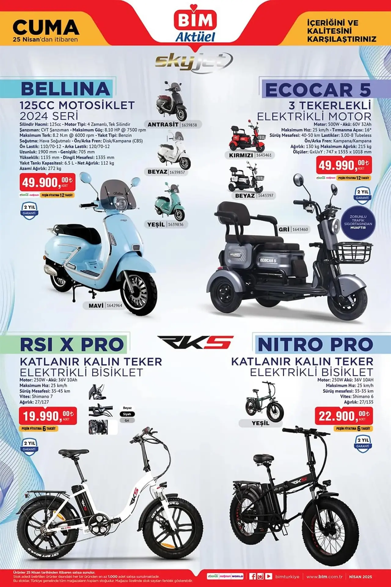 Elektrikli araçlar kategorisinde de fırsatlar sunuluyor. Ecocar 5 3 Tekerlekli Elektrikli Motor 49.990 TL'ye, RSI X Pro Katlanır Kalın Teker Elektrikli Bisiklet ise 19.990 TL'ye satışta. BİM'in bu hafta sunduğu bisiklet ve motor modelleri, hem eğlenceli hem de pratik ulaşım seçenekleri arayanları cezbediyor.