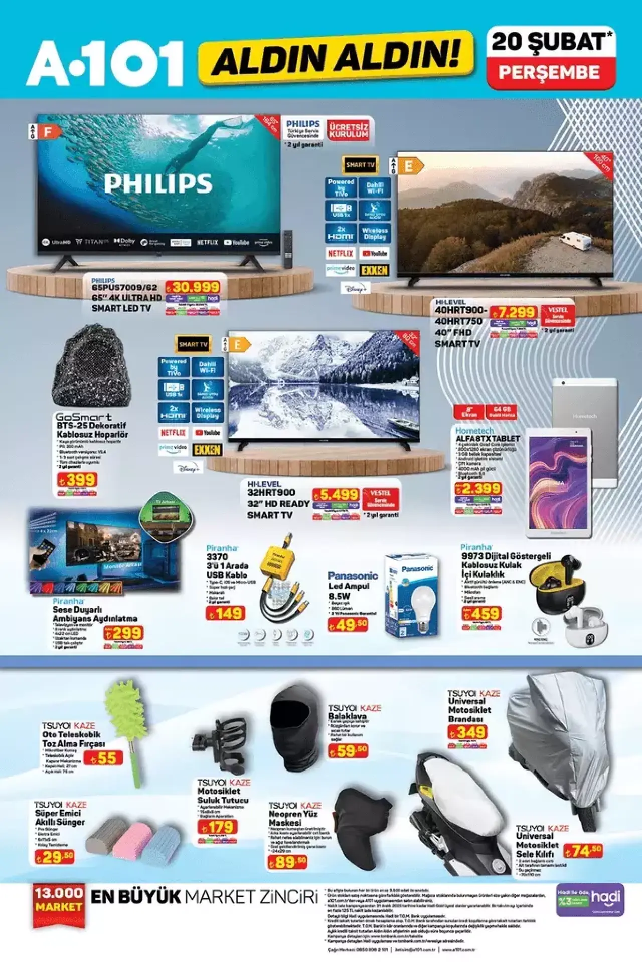 A101'in yeni kataloğunda Hi-Level 40" FHD Smart TV ve Hi-Level 32" HD Ready Smart TV gibi televizyon modelleri dikkat çekiyor. GoSmart Dekoratif Kablosuz Hoparlör 399 TL, Hometech Alfa 8TX Tablet ise 2.399 TL'lik fiyatlarla teknoloji severlerin ilgisini çekmeyi hedefliyor. Ayrıca, Piranha Sese Duyarlı Ambiyans Ürünü aydınlatma de 299 TL'den satışa sunulacak.