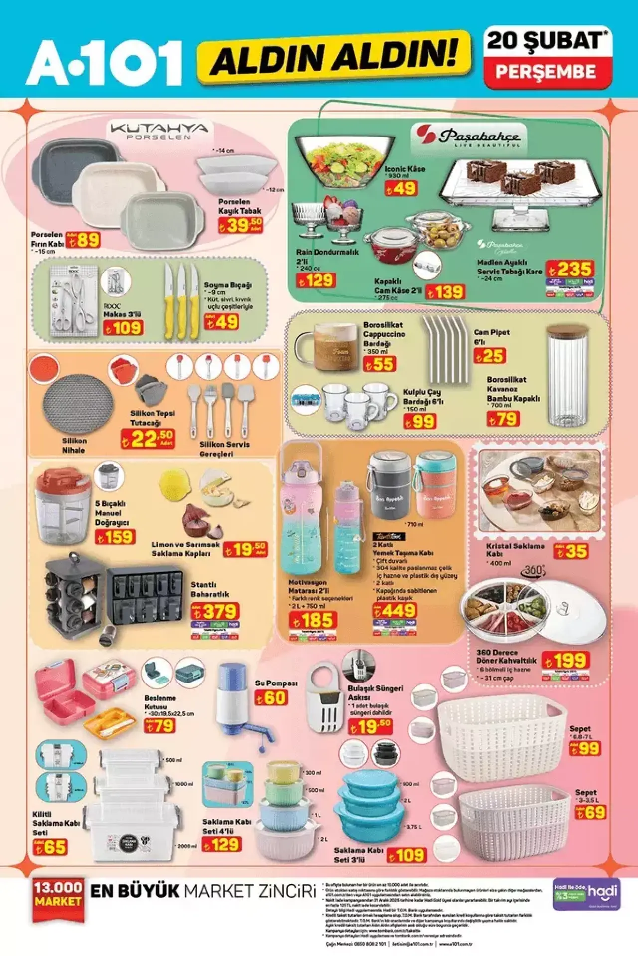 A101, mutfak ürünlerinde de geniş bir yelpaze sunuyor. Porselen Kayık Tabak 39,50 TL, Porselen Fırın Kabı 89 TL ve Madlen Ayaklı Servis Tabağı Kare 235 TL'ye satılacak. Silikon Nihale 22,50 TL, Stantlı Baharatlık ise 379 TL'ye A101 mağazalarında satışa sunulacak.