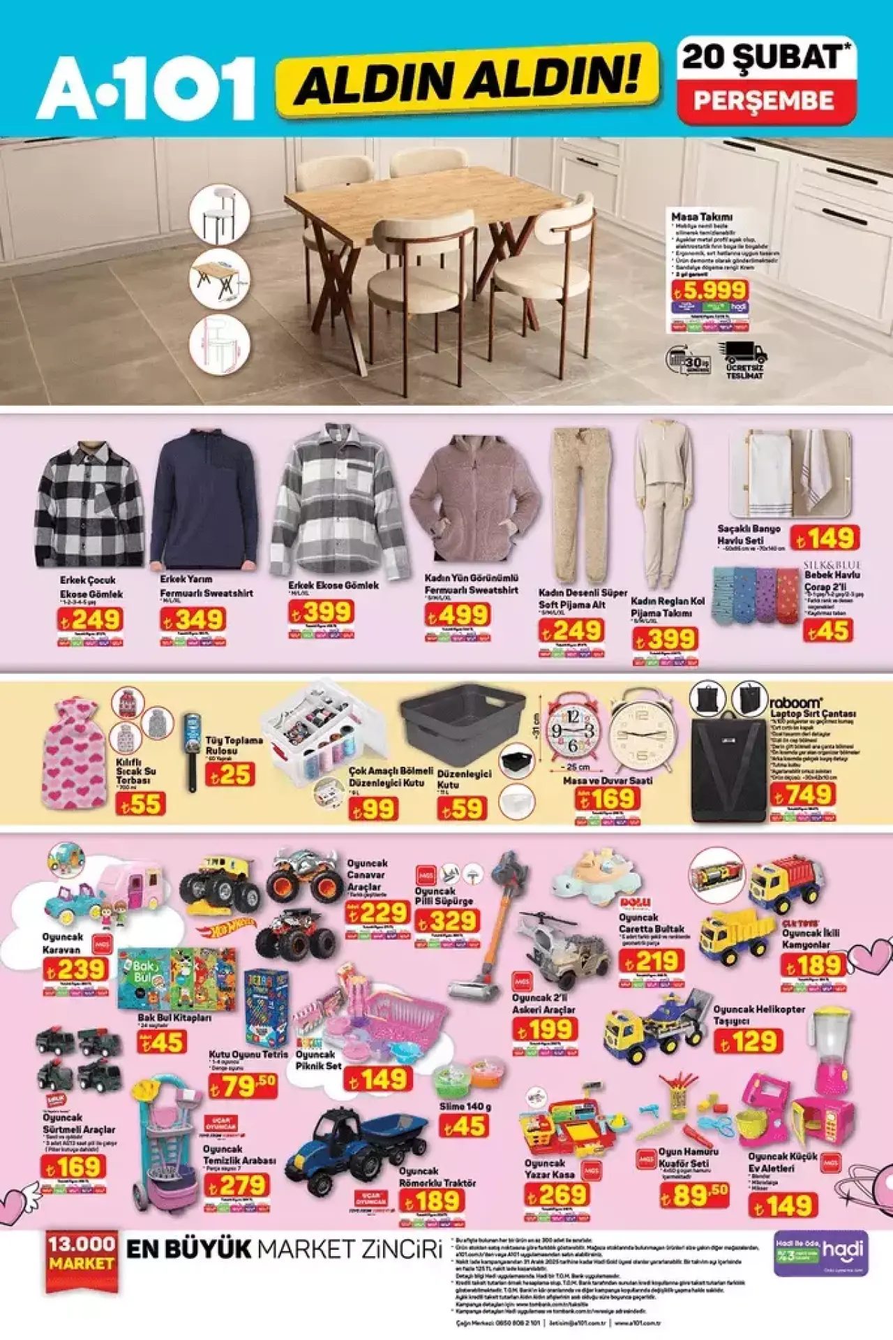 A101, 20 Şubat'tan itibaren şıklığınızı tamamlayacak uygun fiyatlı giyim ve tekstil ürünlerini de satışa sunuyor. Erkek Çocuk Ekose Gömlek 249 TL, Erkek Yarım Fermuarlı Sweatshirt 349 TL, Kılıflı Sıcak Su Torbası 55 TL ve Masa ve Duvar Saati 169 TL'ye alıcılarını bekliyor. Ayrıca, Laptop Sırt Çantası 749 TL'lik fiyatı ile teknolojiyi ve şıklığı bir arada sunuyor.