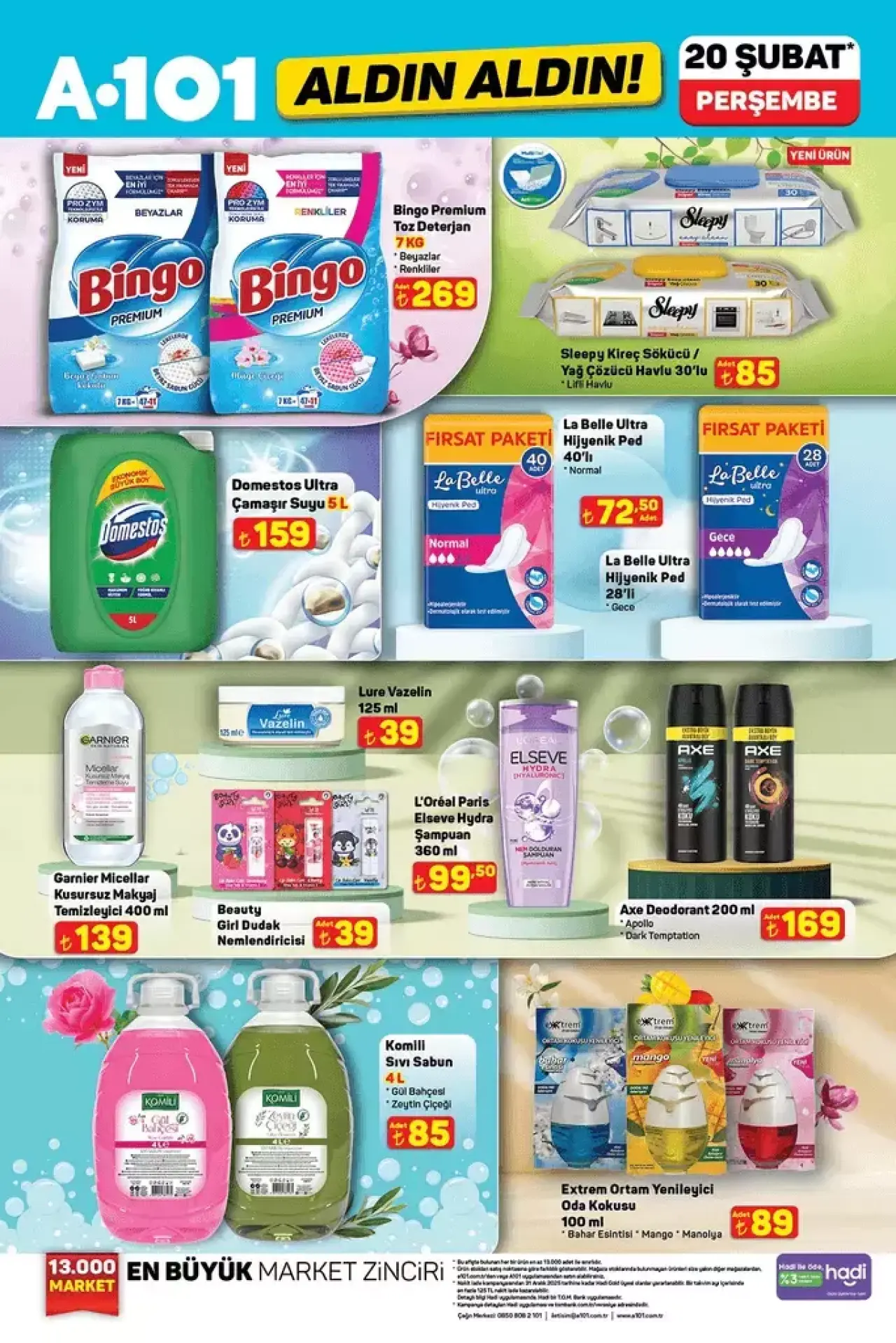 A101'in 20 Şubat kataloğunda, temizlik ürünleri de uygun fiyatlarla yer alıyor. Bingo Premium Toz Deterjan 7 KG 269 TL, Domestos Ultra Çamaşır Suyu 5L 159 TL'ye satılacak. Ayrıca, Sleepy Kireç Sökücü/Yağ Çözücü Havlu 30'lu 85 TL, La Belle Ultra Hijyenik Ped 40'lı 72,50 TL'ye ve Axe Deodorant 200 ml 169 TL'ye alıcılarını bekliyor.