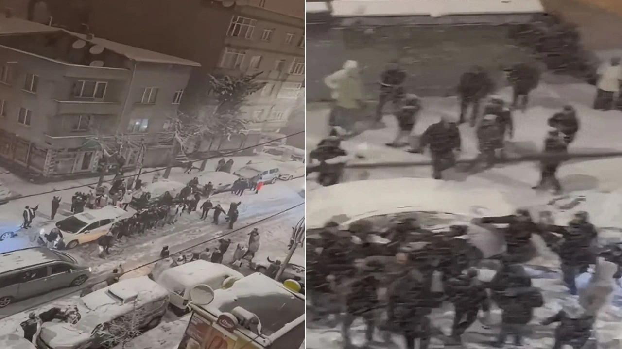 Kar topu oynarken eğlenen grup, bir süre sonra aniden kavga etmeye başladı. Kavgaya neyin sebep olduğu henüz belirlenemezken, ortamın gerilmesiyle sokaktaki eğlence aniden sona erdi. Çevredeki insanlar, kavgayı ayırmaya çalıştı ve kıs süre içinde olay yatıştırıldı.