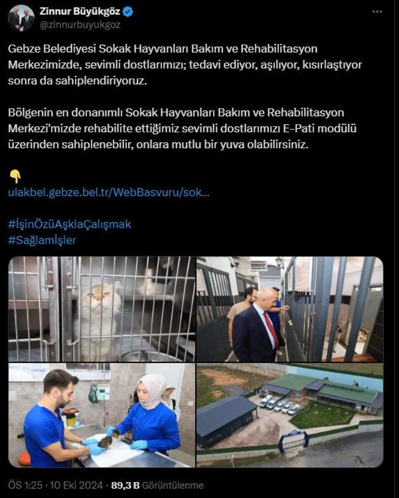 Büyükgöz X hesabı üzerinden yaptığı paylaşımında şunları dedi: "Gebze Belediyesi Sokak Hayvanları Bakım ve Rehabilitasyon Merkezimizde, sevimli dostlarımızı; tedavi ediyor, aşılıyor, kısırlaştıyor sonra da sahiplendiriyoruz. Bölgenin en donanımlı Sokak Hayvanları Bakım ve Rehabilitasyon Merkezi'mizde rehabilite ettiğimiz sevimli dostlarımızı E-Pati modülü üzerinden sahiplenebilir, onlara mutlu bir yuva olabilirsiniz."