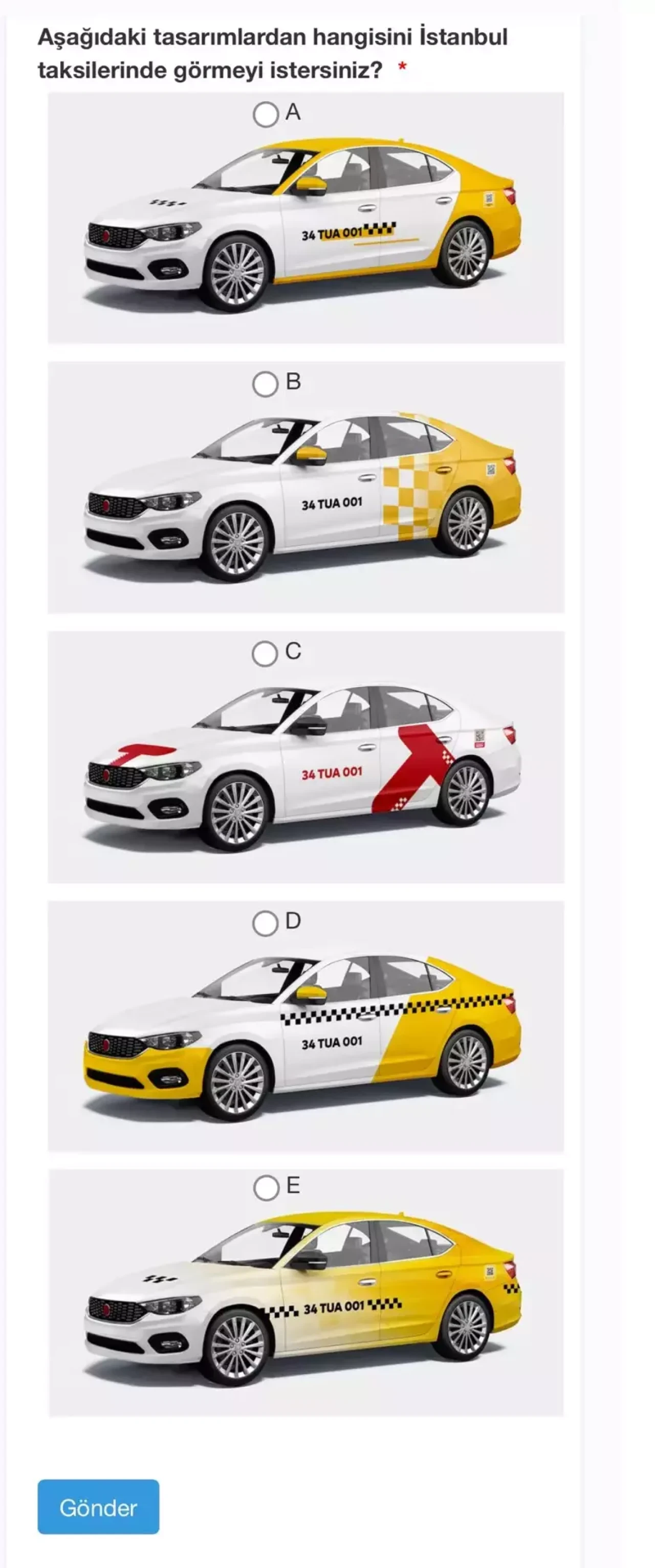Yeni taksi tasarımlarını belirlemek için İBB tarafından başlatılan anket, halkın görüşlerini almak için önemli bir adım olarak öne çıkıyor. İstanbul'daki vatandaşlar, 5 farklı tasarım seçeneğinden birini seçmek için oy verebilecekler. Anketin sonuçları doğrultusunda, en çok tercih edilen tasarım uygulama tabanlı ticari taksilerde kullanılacak. Bu süreç, vatandaşların fikirlerine değer verildiği bir katılımcı yönetim yaklaşımını da simgeliyor.