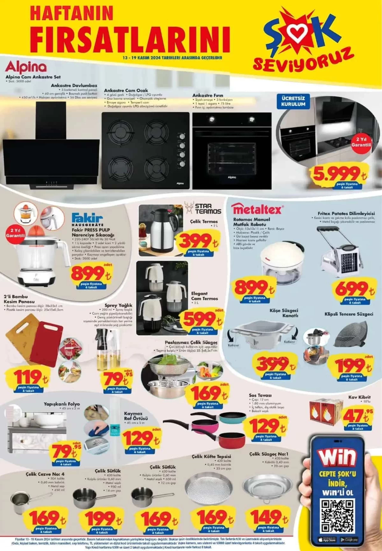 Bu haftanın dikkat çeken ürünlerinden biri Alpina Cam Ankastre Set. 3 kademeli davlumbaz, doğalgaz/LPG uyumlu ocak ve LED göstergeli 57 litrelik fırından oluşan set, 5.999 TL fiyatıyla sunuluyor. Ürün, kredi kartına 6 taksit imkânı ile hem mağazalarda hem de Cepte ŞOK uygulamasında yerini aldı.