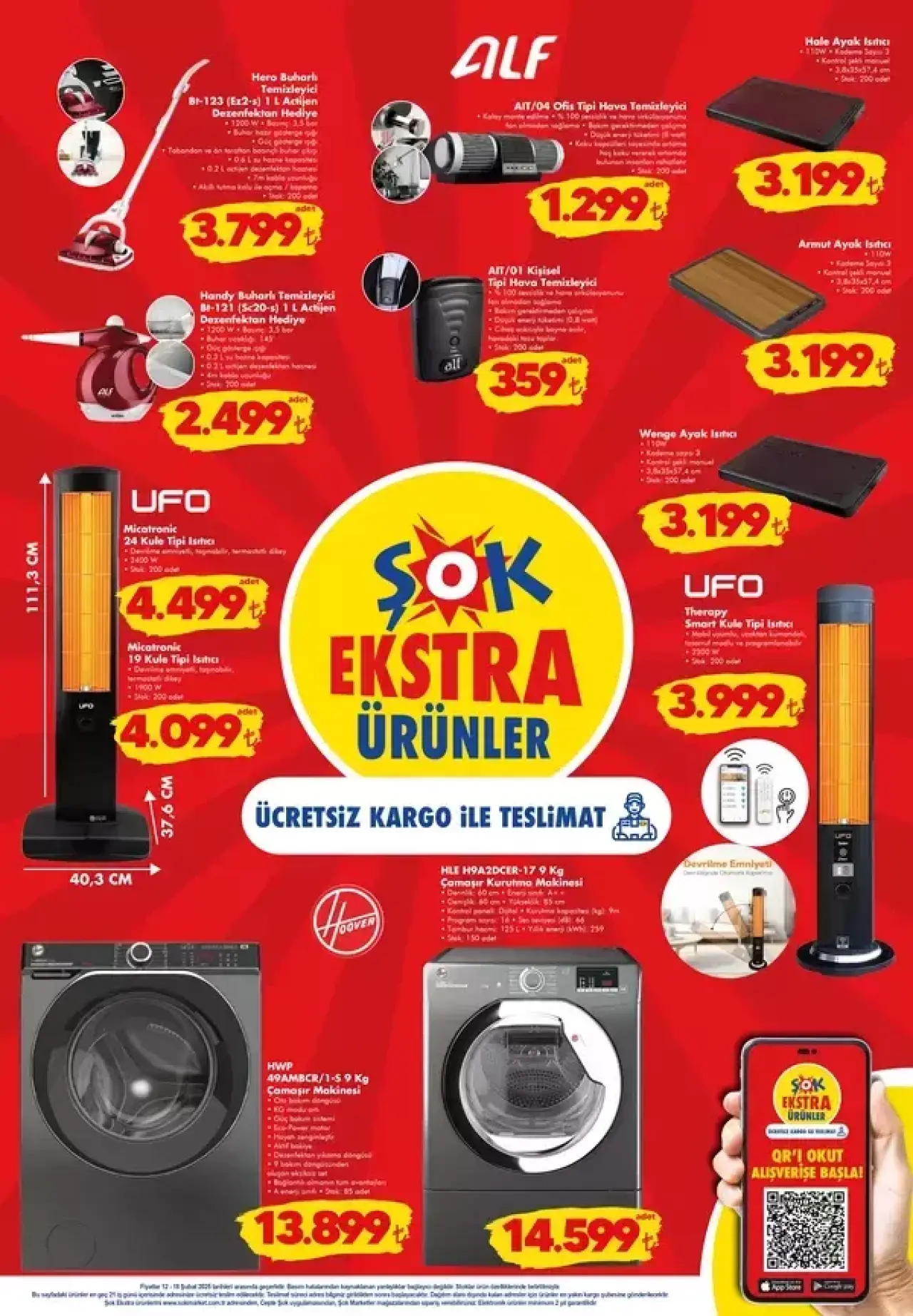 Evde rahatlıkla kullanılabilecek birçok elektrikli ürün de ŞOK markette yer alıyor. ALF Hero Buharlı Temizleyici 3.799 TL, ALF AIT/04 Ofis Tipi Hava Temizleyici 1.299 TL’ye satışa sunuluyor. Ayrıca Sinbo Banyo Baskülü 219 TL, Hoover Çamaşır Kurutma Makinesi 14.599 TL gibi farklı ürünlerle evinizi güzelleştirebilirsiniz.