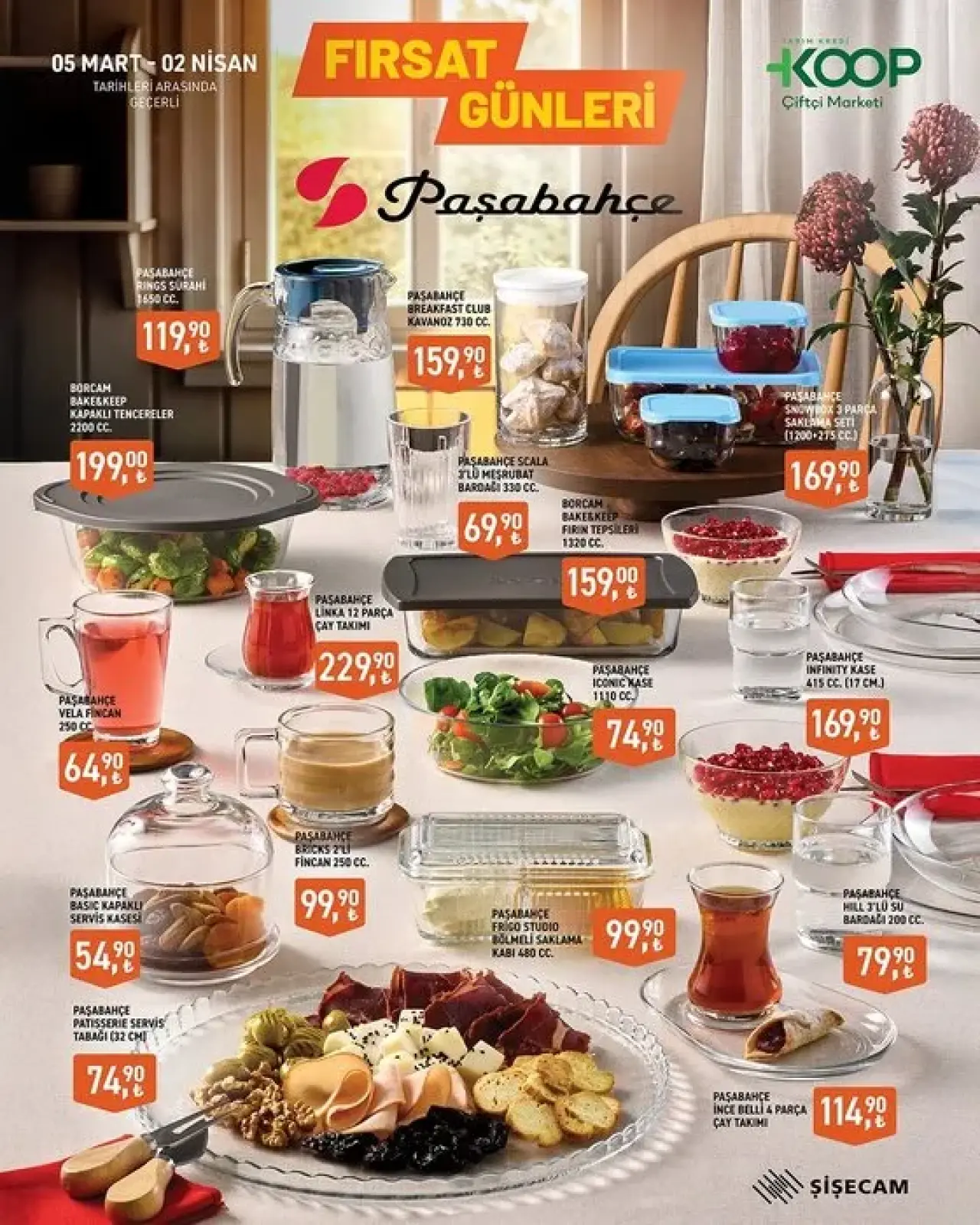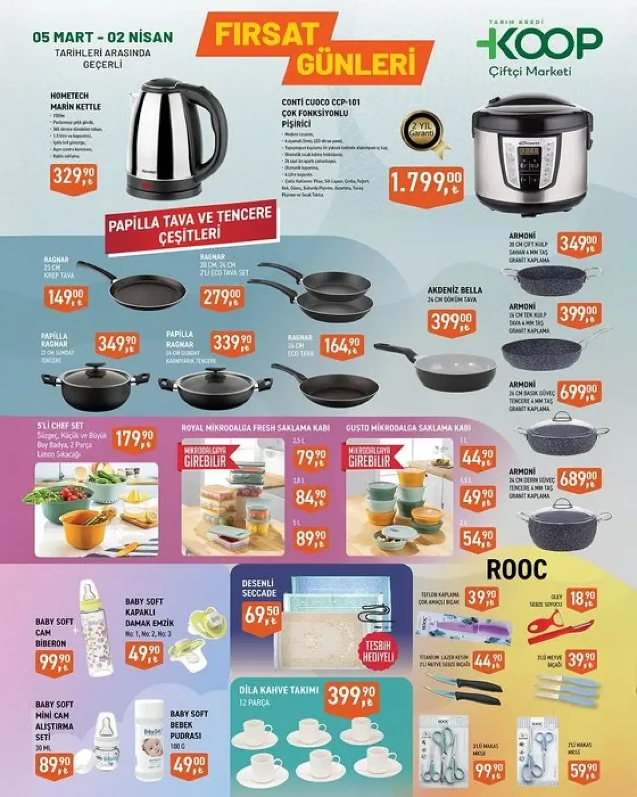 Tarım Kredi Kooperatif, evde kullanılan mutfak ürünlerine yönelik birçok fırsat sunuyor. Çay takımı, sürahi, saklama kabı, fırın tepsisi gibi mutfak gereçleri, şıklıklarıyla dikkat çekiyor. İşte fiyatlarıyla dikkat çeken bazı ürünler: