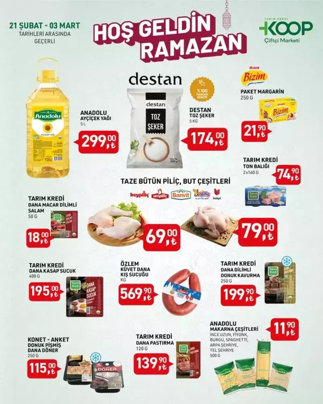 Tarım Kredi Kooperatif Market, 21 Şubat - 3 Mart 2025 tarihleri arasında geçerli olacak yeni aktüel kataloğunu yayımladı. Bu dönemde, market müşterilerine geniş bir ürün yelpazesinde büyük indirimler sunuluyor. Kahvaltılıklardan temizlik malzemelerine kadar pek çok üründe indirim fırsatları dikkat çekiyor. Beyaz peynir, zeytinyağı, sucuk, tavuk gibi temel gıda maddeleri yanı sıra, çay, atıştırmalıklar ve temizlik ürünleri de bu dönemde uygun fiyatlarla tüketicilere sunulacak. Tarım Kredi Kooperatif Market'in yeni kataloğunda yer alan bu fırsatlar, bütçenizi sarsmadan kaliteli ürünleri almanıza olanak tanıyacak.