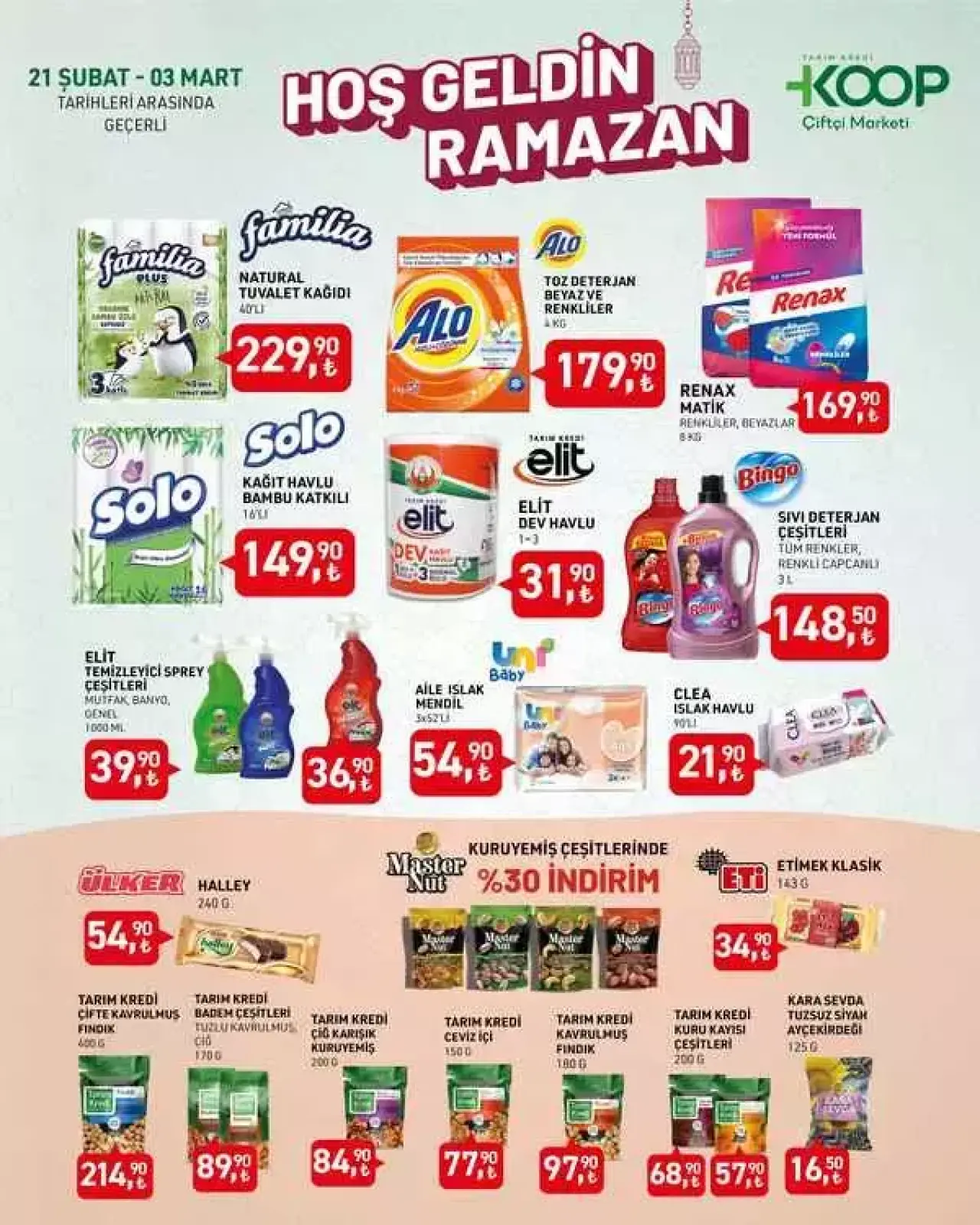 Ev temizliği için gerekli olan ürünler de Tarım Kredi Kooperatif Market'te uygun fiyatlarla satışa sunuluyor. Tuvalet kağıdı, sıvı deterjan ve ıslak mendil gibi temizlik ürünlerinde büyük indirimler bulunuyor: