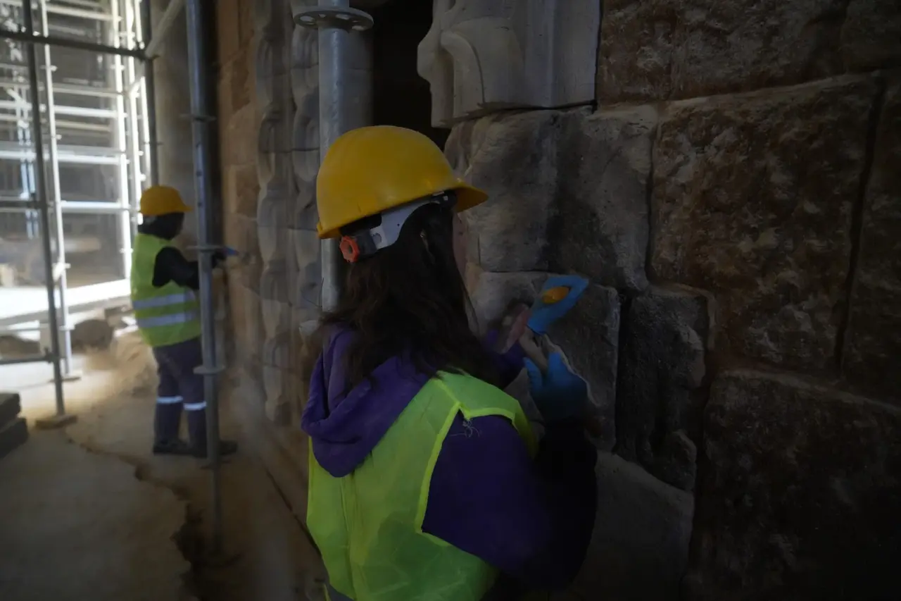 Camide altı çelik sütun ayağı taş kaplama ile tamamlandı. Restorasyon ekibi, duvar güçlendirme ve taş işçiliği üzerinde çalışmalarını sürdürüyor.