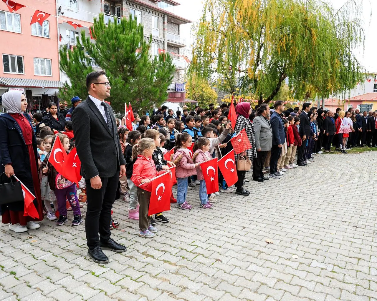 Öğrenciler ve öğretmenler bayram coşkusuna ortak oldu. Siyasi parti temsilcileri de kutlamalara katılım sağladı.