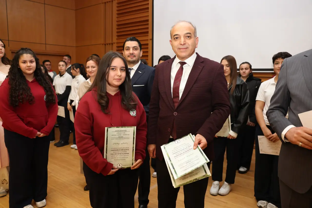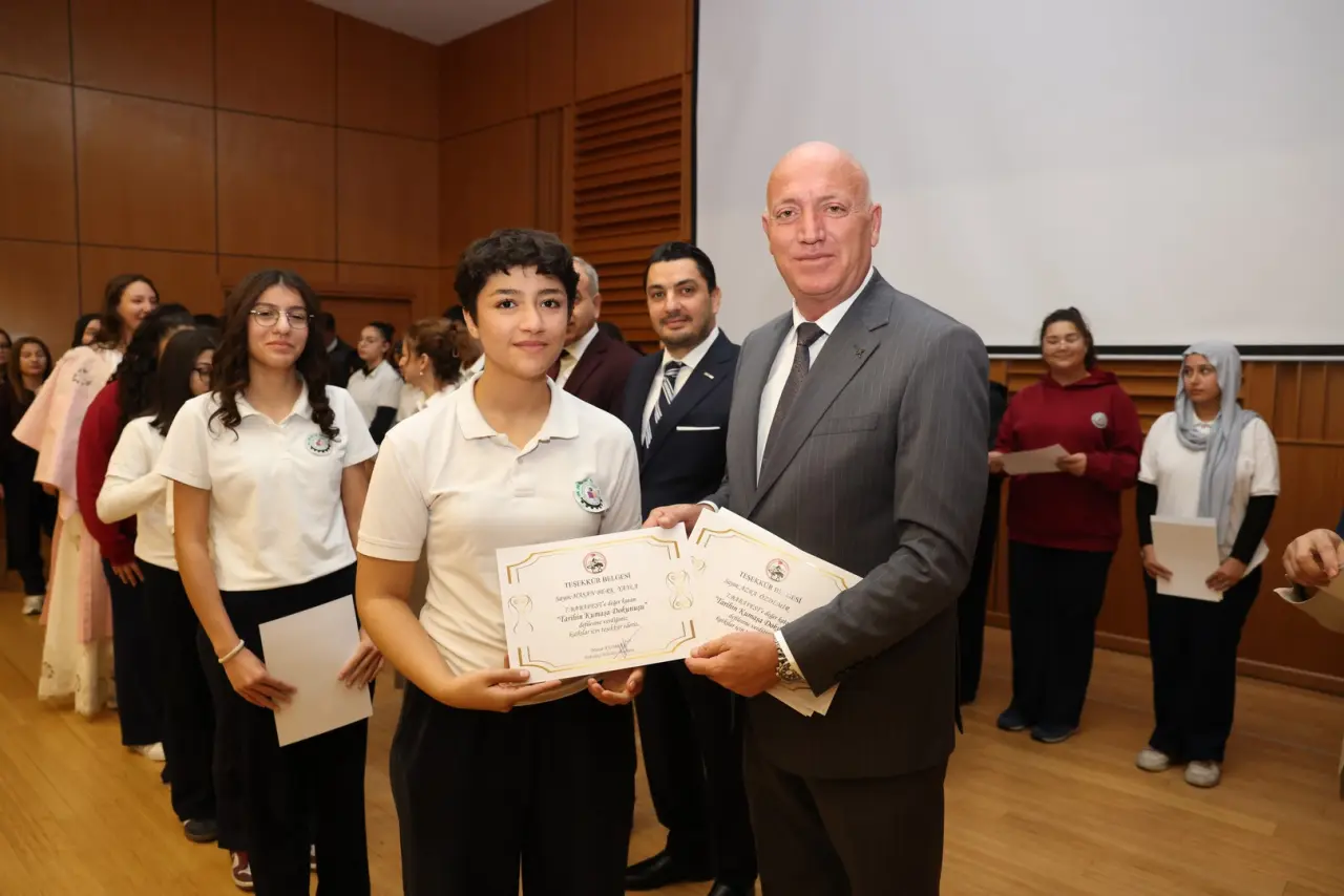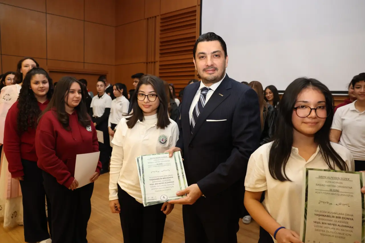 Törende, öğretmen ve öğrencilere sertifikaları verildi. Ayrıca BASİAD Hatıra Ormanı’na dikilen fidanların sertifikaları takdim edildi.