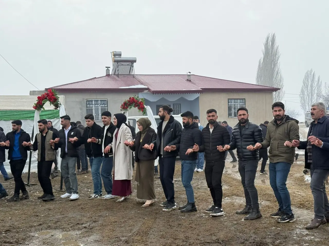 Karakuyu köyünde düzenlenen düğünde eriyen karlar çamur oluşturdu. Misafirler bu zorluğa rağmen halay çekerek eğlenceye devam etti.