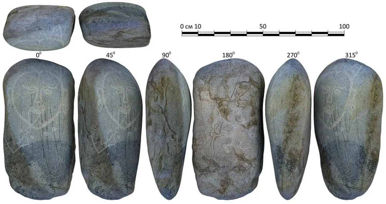 Çüy bölgesindeki Borombay arkeolojik kompleksinde yapılan kazılarda bulunan taş, üç boynuzlu başlıklı bir kadın tasviri içeriyor. Bu tür bir tümülüs yapısına Altay'da ilk kez rastlandığı belirtildi.